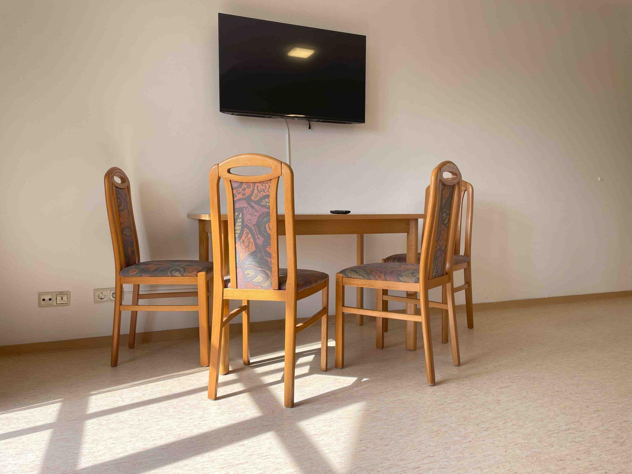 Die möblierte 65 m² große Dachgeschosswohnung in Stamsried umfasst zwei Schlafzimmer mit jeweils zwei Einzelbetten und ist für bis zu vier Personen geeignet. Es besteht die Möglichkeit, dass eine fünfte Person auf dem Sofa schläft.