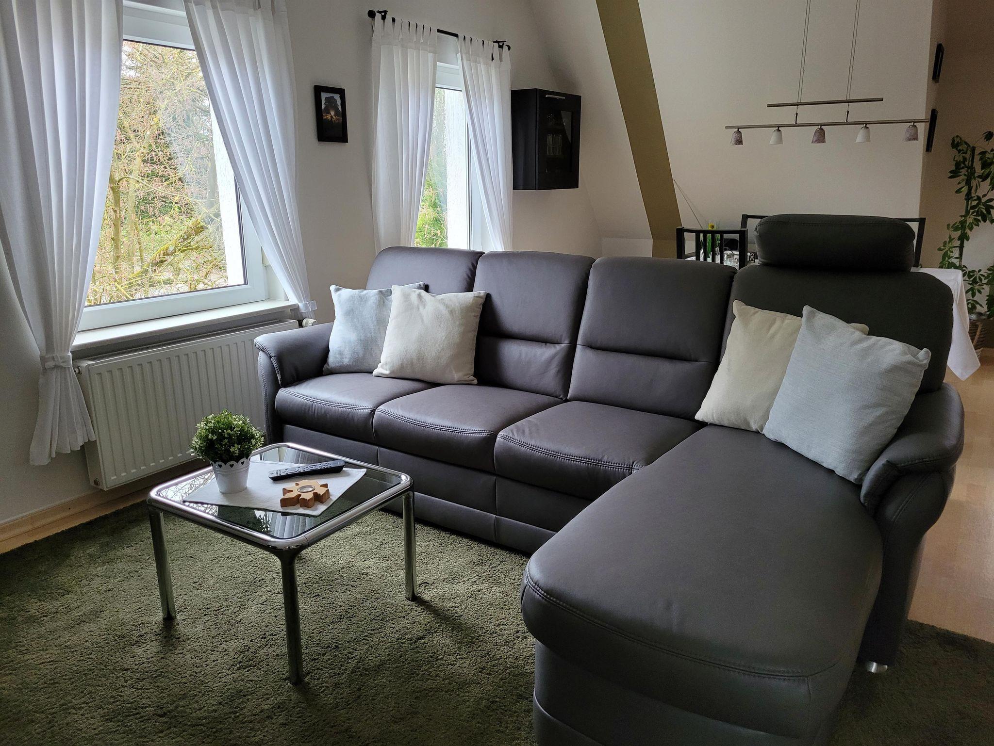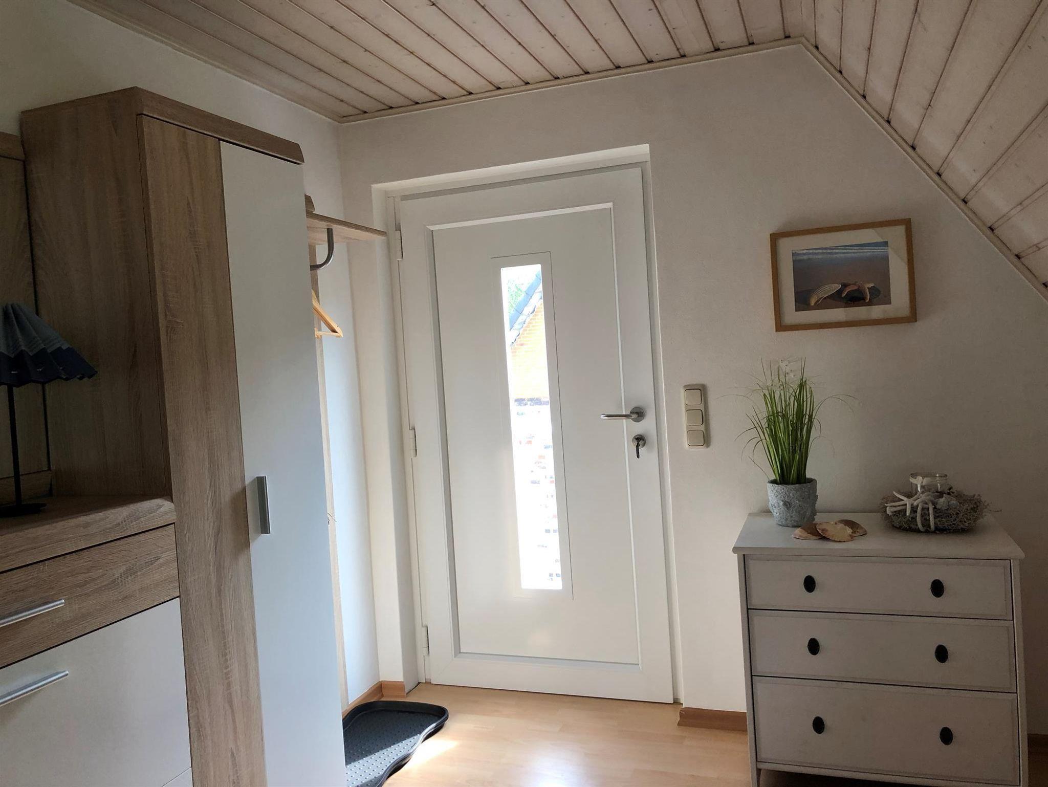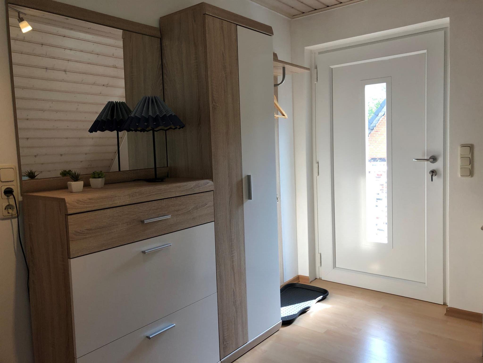 Die Ferienwohnung ist über eine Treppe im Außenbereich erreichbar. Sie verfügt über einen Eingangsbereich, eine komplett ausgestattete Küche, ein Schlafzimmer mit einem Doppelbett und einem ausziehbaren Schlafsofa, ein Wohn- / Esszimmer mit Schlafsofa für die dritte Person sowie ein Bad mit Dusche und WC.