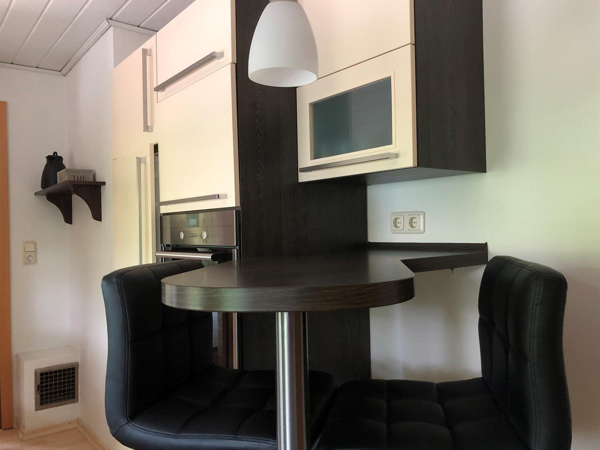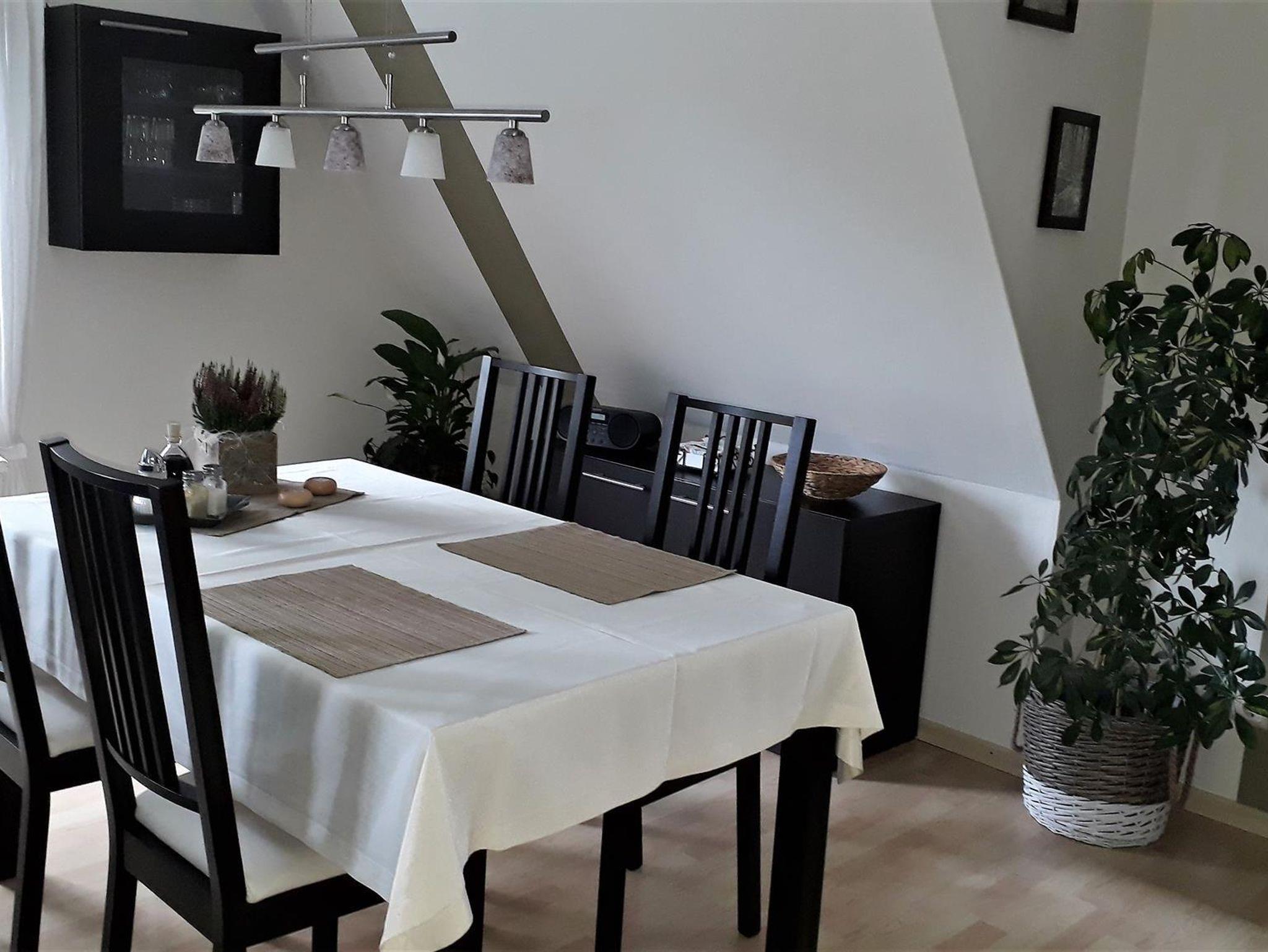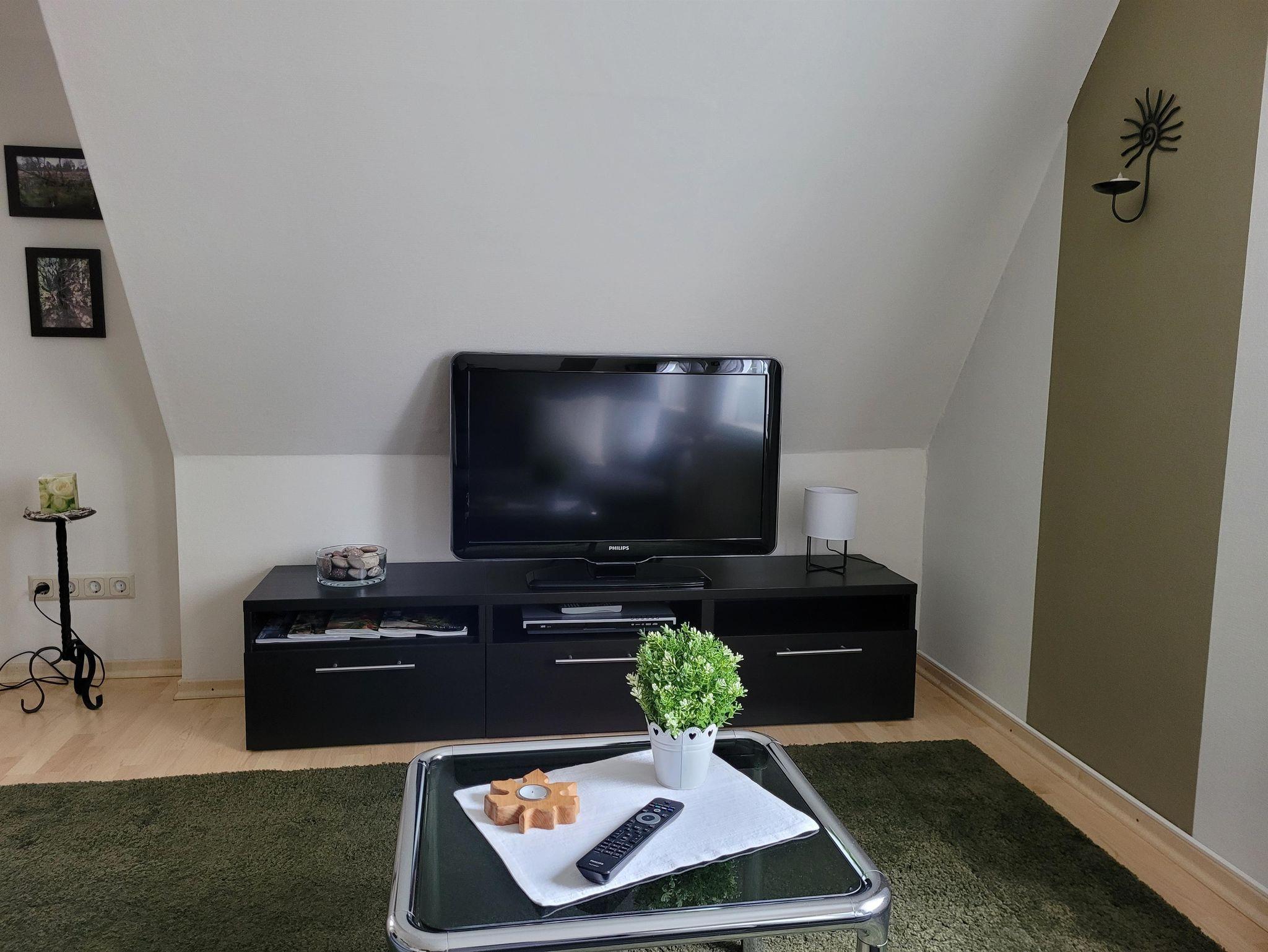 Die Ferienwohnung ist über eine Treppe im Außenbereich erreichbar. Sie verfügt über einen Eingangsbereich, eine komplett ausgestattete Küche, ein Schlafzimmer mit einem Doppelbett und einem ausziehbaren Schlafsofa, ein Wohn- / Esszimmer mit Schlafsofa für die dritte Person sowie ein Bad mit Dusche und WC.