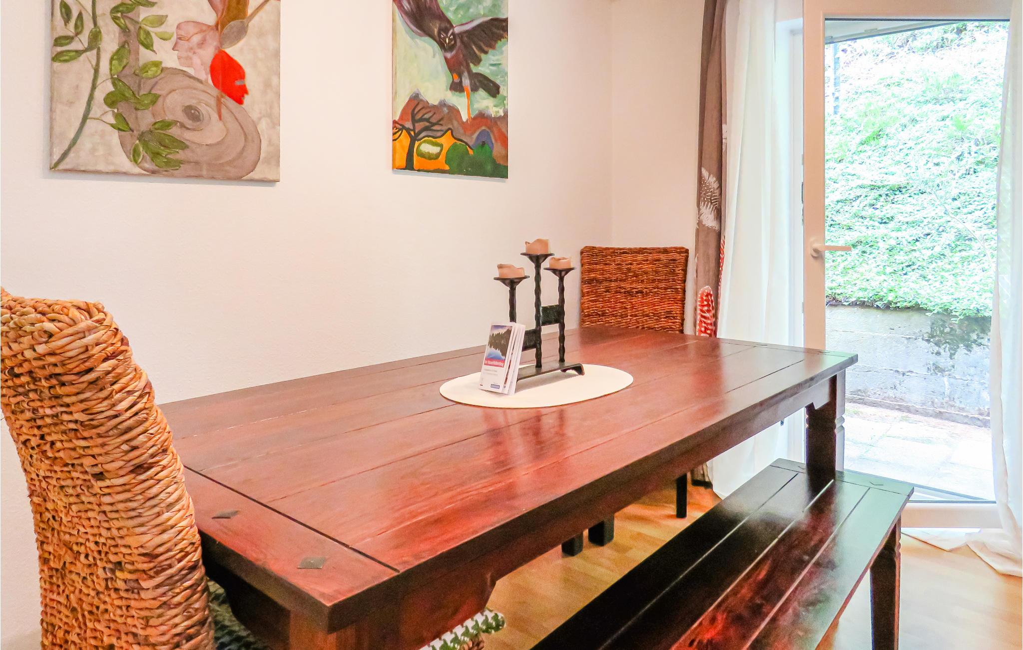 Die helle, moderne Wohnung ist liebevoll und behaglich eingerichtet. In der kleinen Küche finden Sie alles, was Sie zum Kochen benötigen. Eine Spülmaschine und ein Backofen auf Augenhöhe sowie eine große Kühl- Gefrierkombination sind vorhanden.Durch das neben der Küche liegende separate Esszimmer führt eine Terrassentür auf die sehr große entlang dem Haus teilüberdachte nach Osten ausgerichtete, geschützte Waldterrasse.