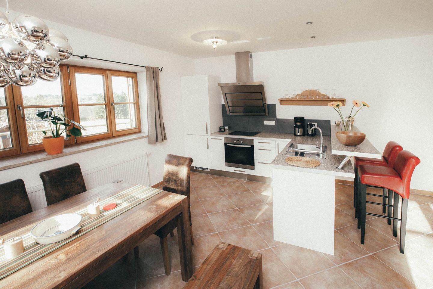 Der helle Wohnbereich lädt mit großer Sitzlandschaft, Flat-TV und gemütlichem Ambiente zum Verweilen ein. Die offene Küche mit Bartresen ist vollständig ausgestattet und wird schnell zum Mittelpunkt gemeinsamer Momente. Mediterrane Fliesen in Erdtönen schaffen ein warmes, harmonisches Wohngefühl.