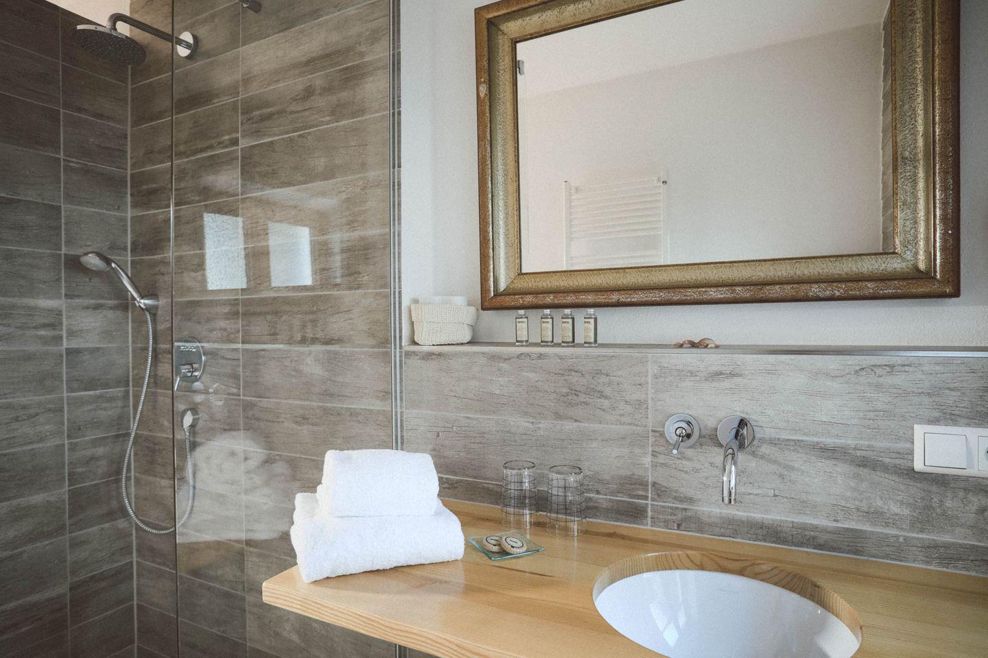 Luna Mia 2 bietet zwei Schlafzimmer mit eigenem Bad, eine offene Küche, einen stilvoll eingerichteten Wohnbereich mit Schlafsofa & eine große Terrasse mit direktem Zugang zum Kastaniengarten – perfekt für Gäste, die Raum, Design & Natur verbinden möchten.