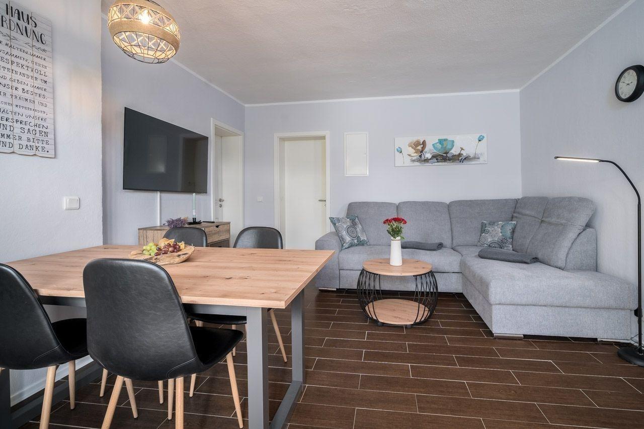 Die Ferienwohnung bietet eine komfortable und allergikergeeignete Unterbringung, ideal für Familien oder Paare. Sie verfügt über zwei gemütliche Schlafzimmer mit insgesamt zwei Doppelbetten und ein modernes Badezimmer mit bodengleicher Dusche und Fenster. Die offene Wohnküche ist mit einem Elektro-/Gasherd, Backofen, Kühlschrank, Kaffeemaschine und Geschirr ausgestattet, sodass sich jedes Mahl leicht zubereiten lässt. Ein Esstisch lädt zu gemeinsamen Stunden ein, während die HiFi-Anlage und der Fernseher für Unterhaltung sorgen.
