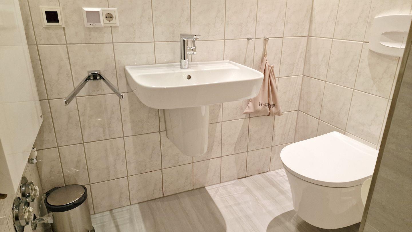 Das Schlafzimmer ist hell und mit einem Boxspringbett und Kleiderschrank möbliert. Im Badezimmer finden Sie eine Dusche, einen Waschtisch, Föhn und WC.