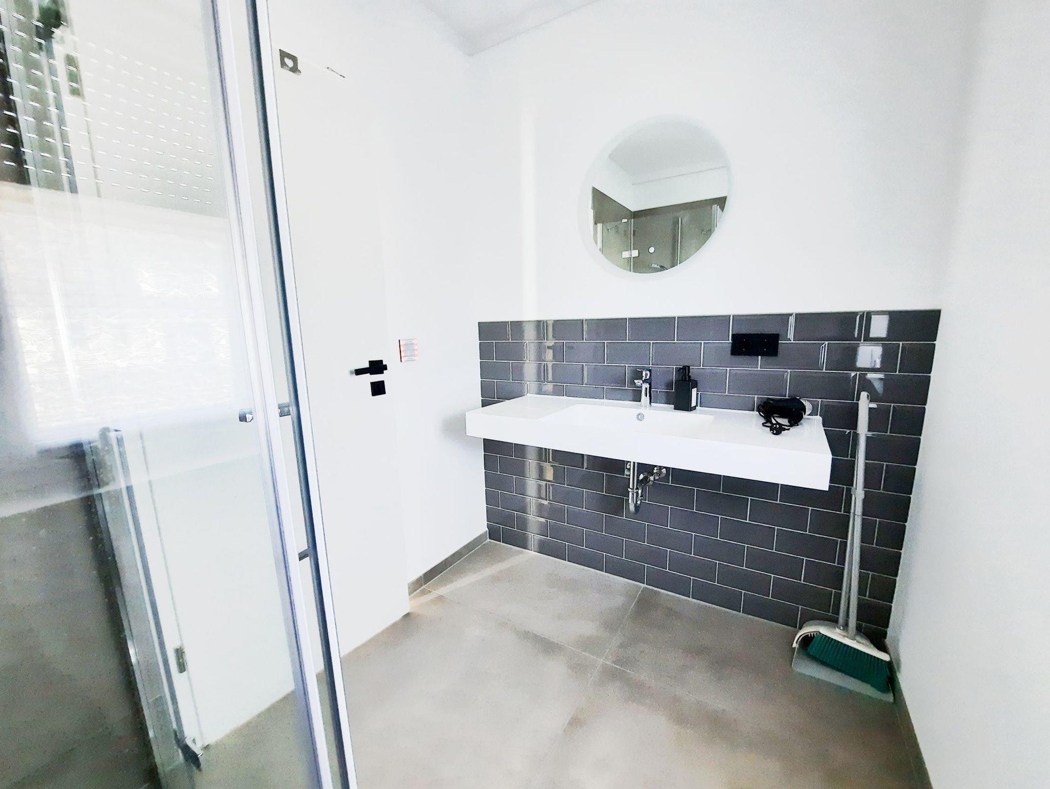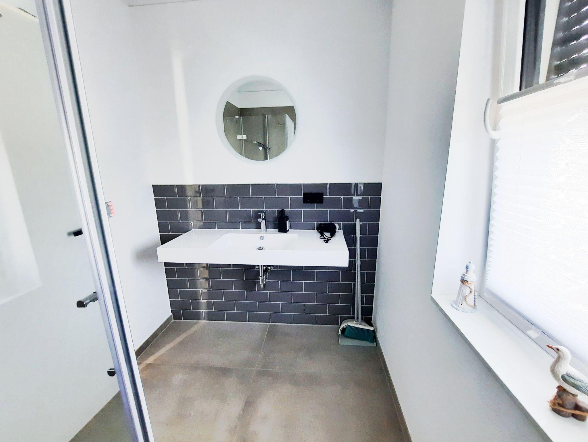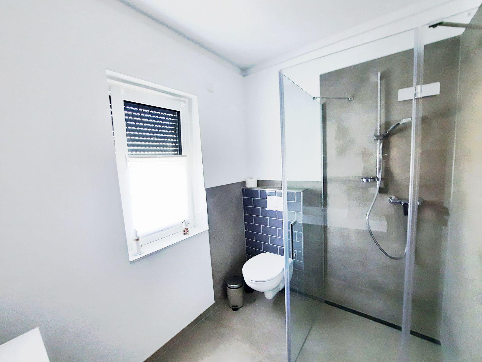 Das Bad mit Fenster verfügt über eine ebenerdige Dusche und ein WC.