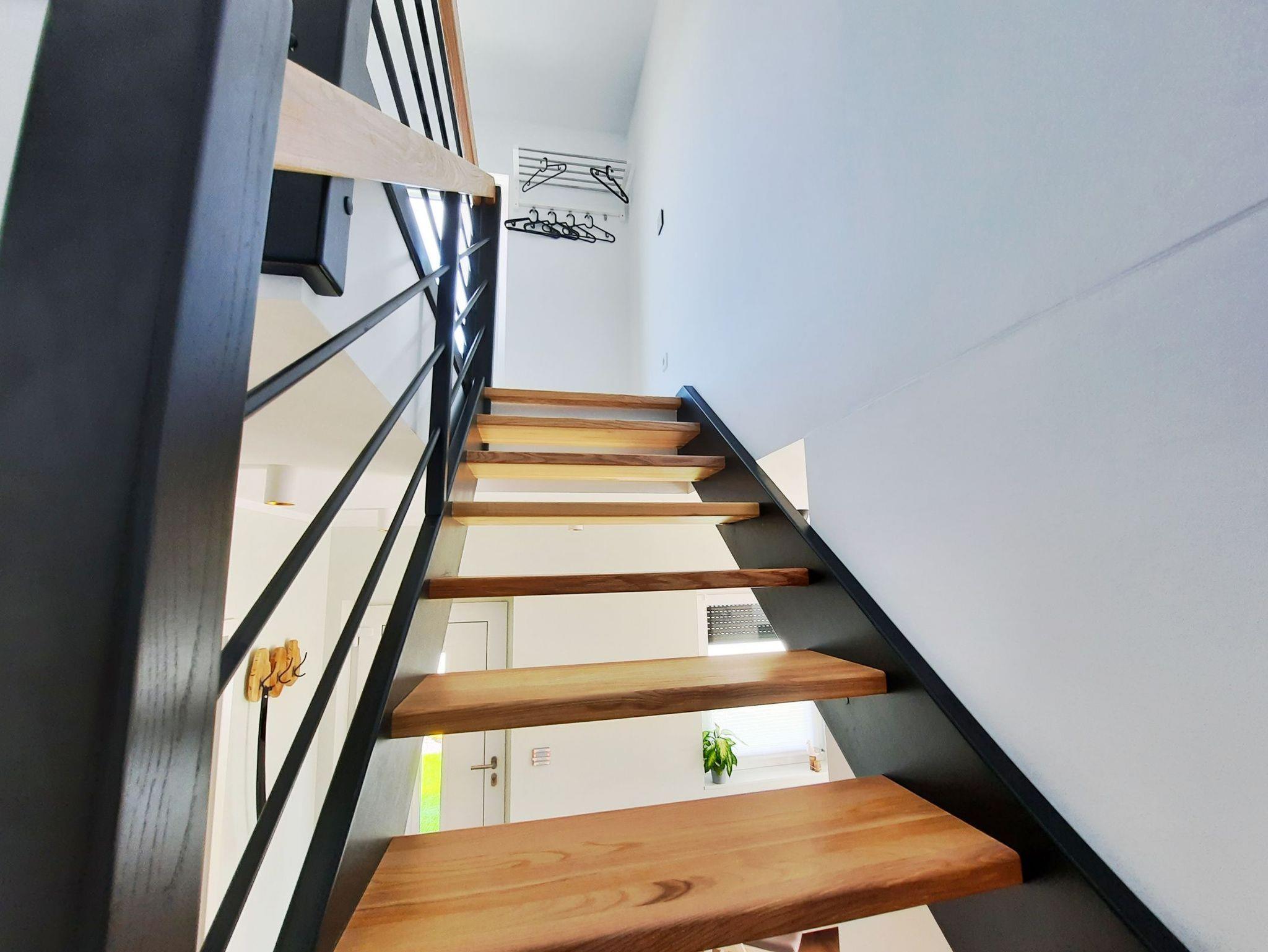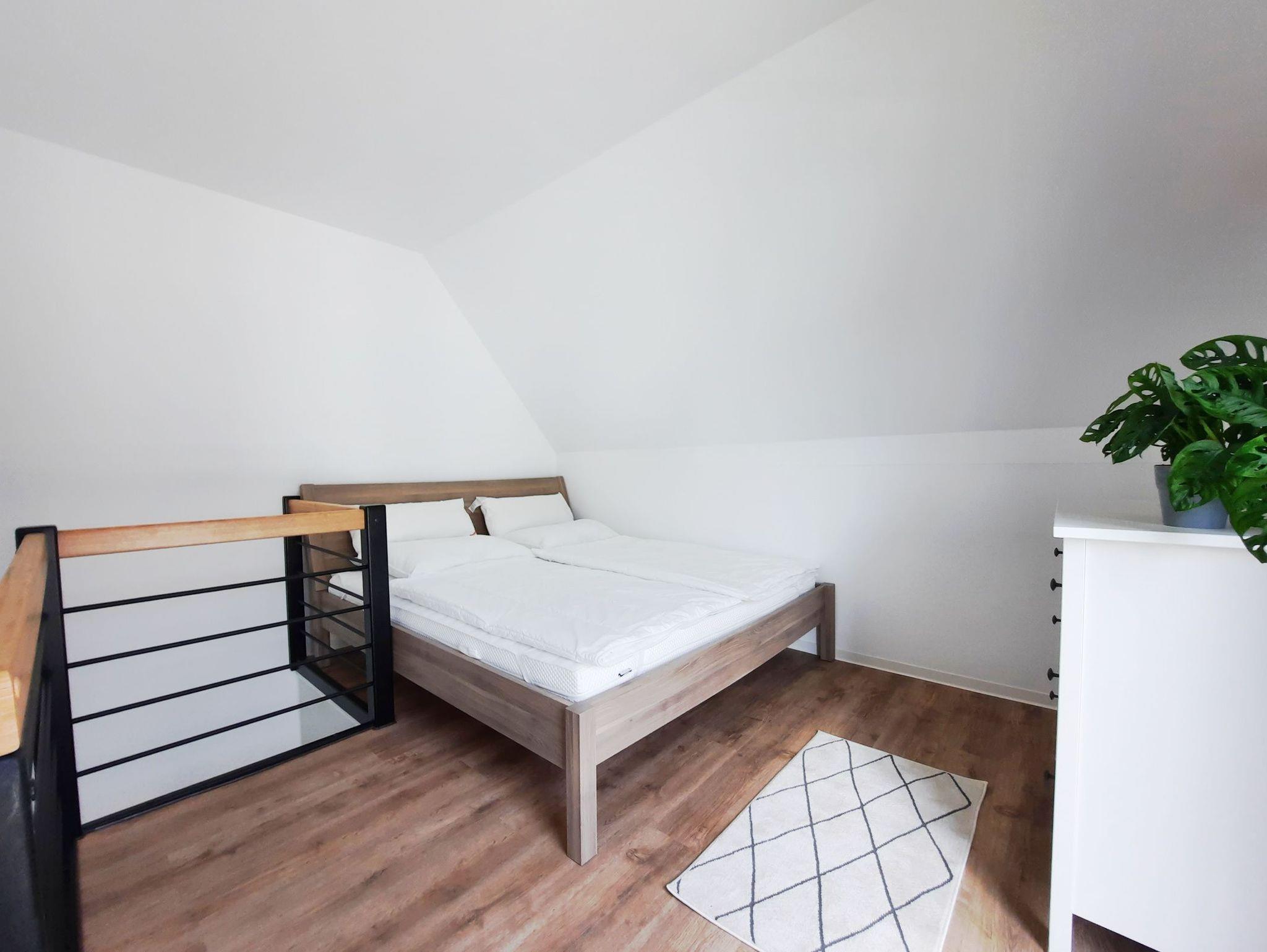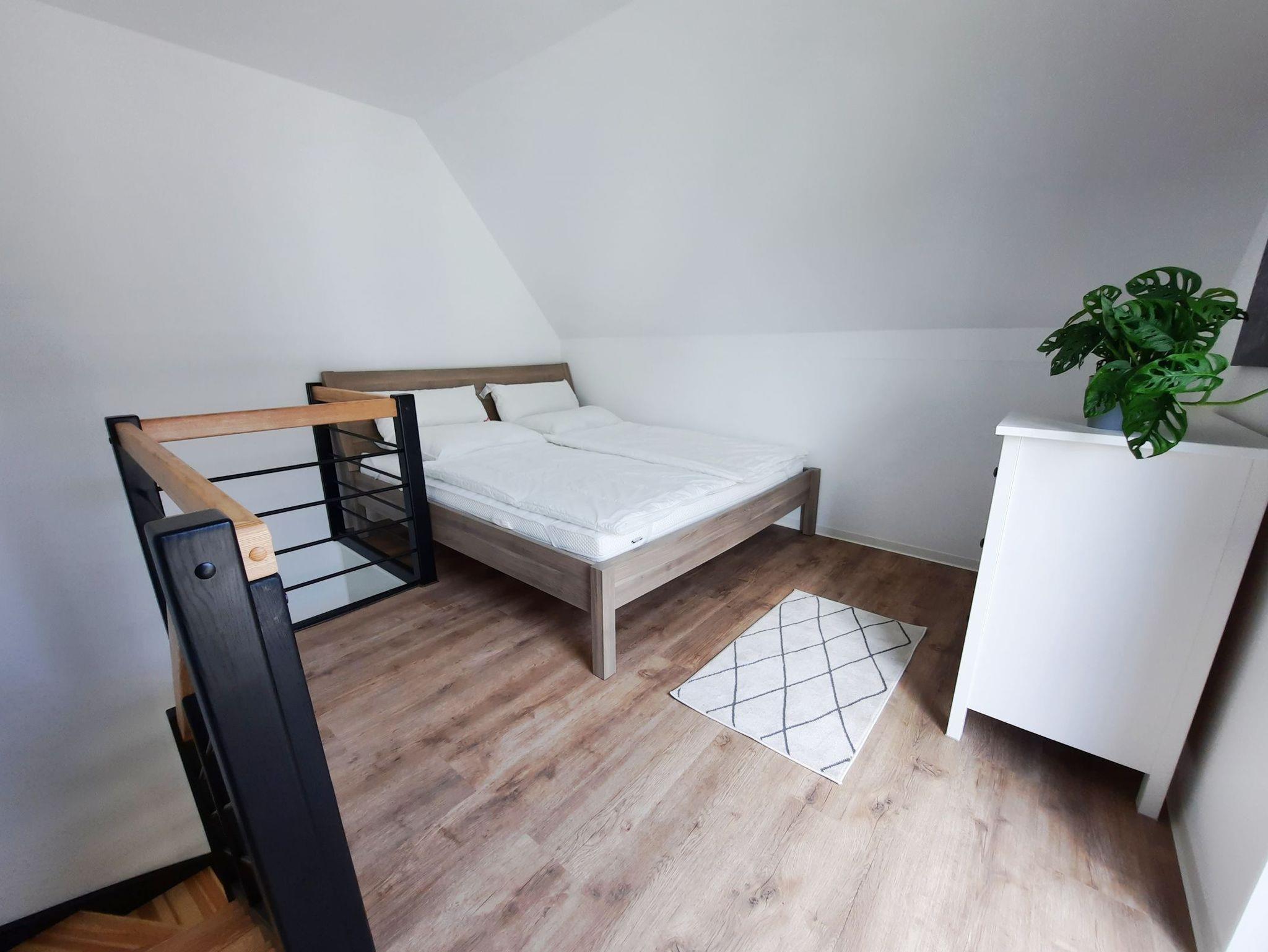 Über eine Treppe gelangen Sie zum offenen Schlafzimmer. Darin befinden sich eine Kommode und ein Doppelbett mit einer breiten Matratze (180x200 cm).