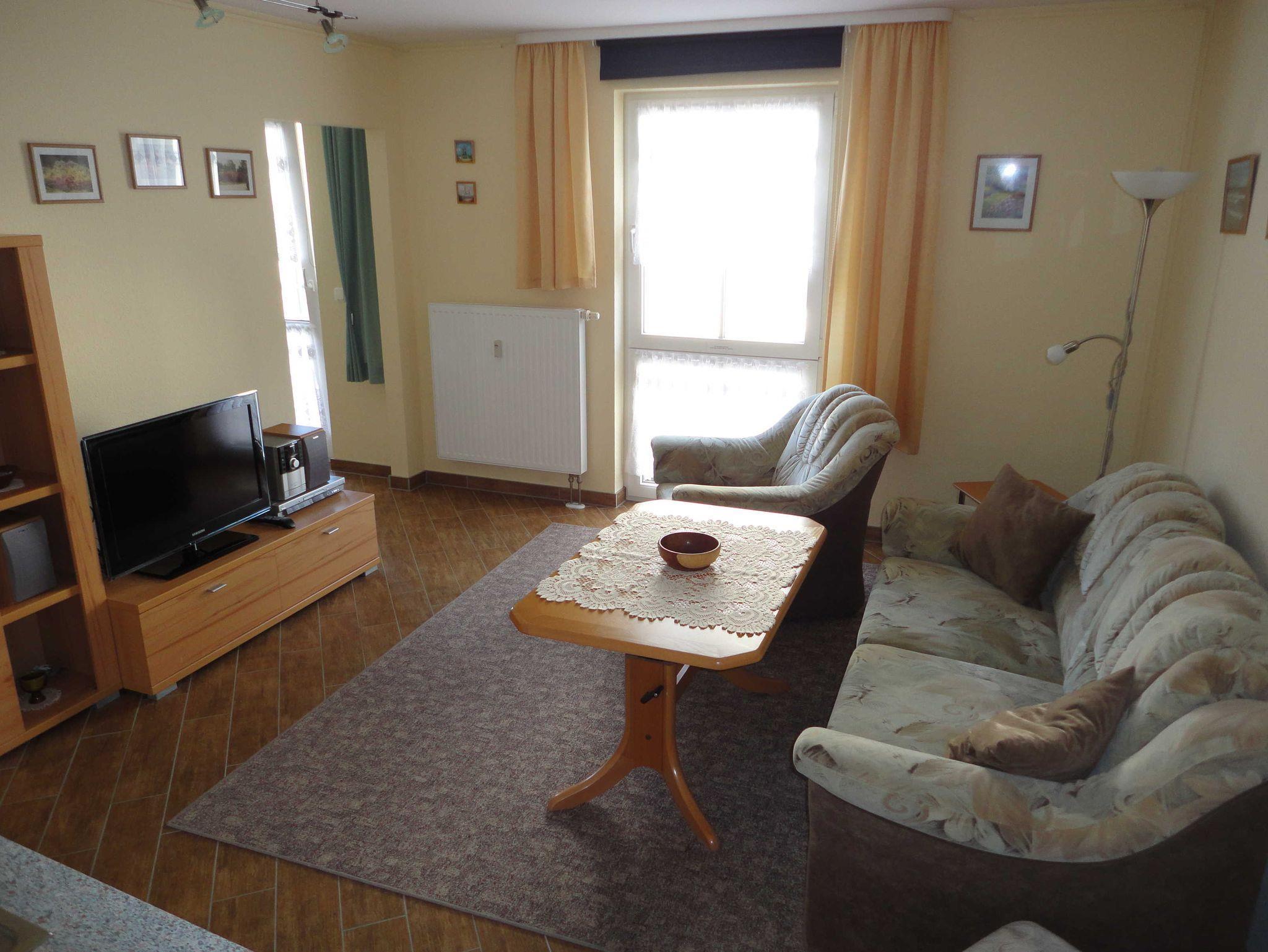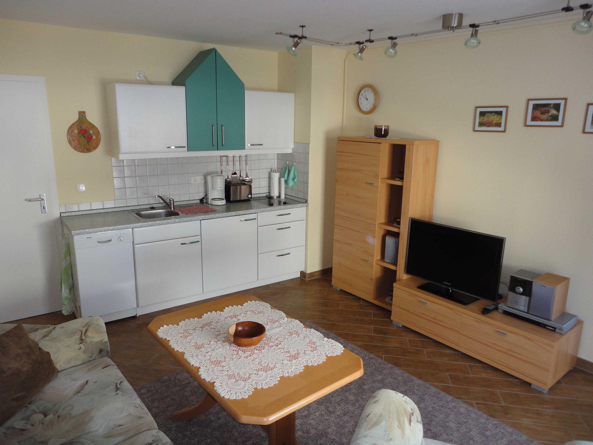 Die Wohnung liegt in der ersten Etage, ist komplett ausgestattet und verfügt über ein Wohnzimmer mit Küchenzeile, Schlafzimmer, Bad und Balkon. Die Möbel wurden im Frühjahr 2016 erneuert.