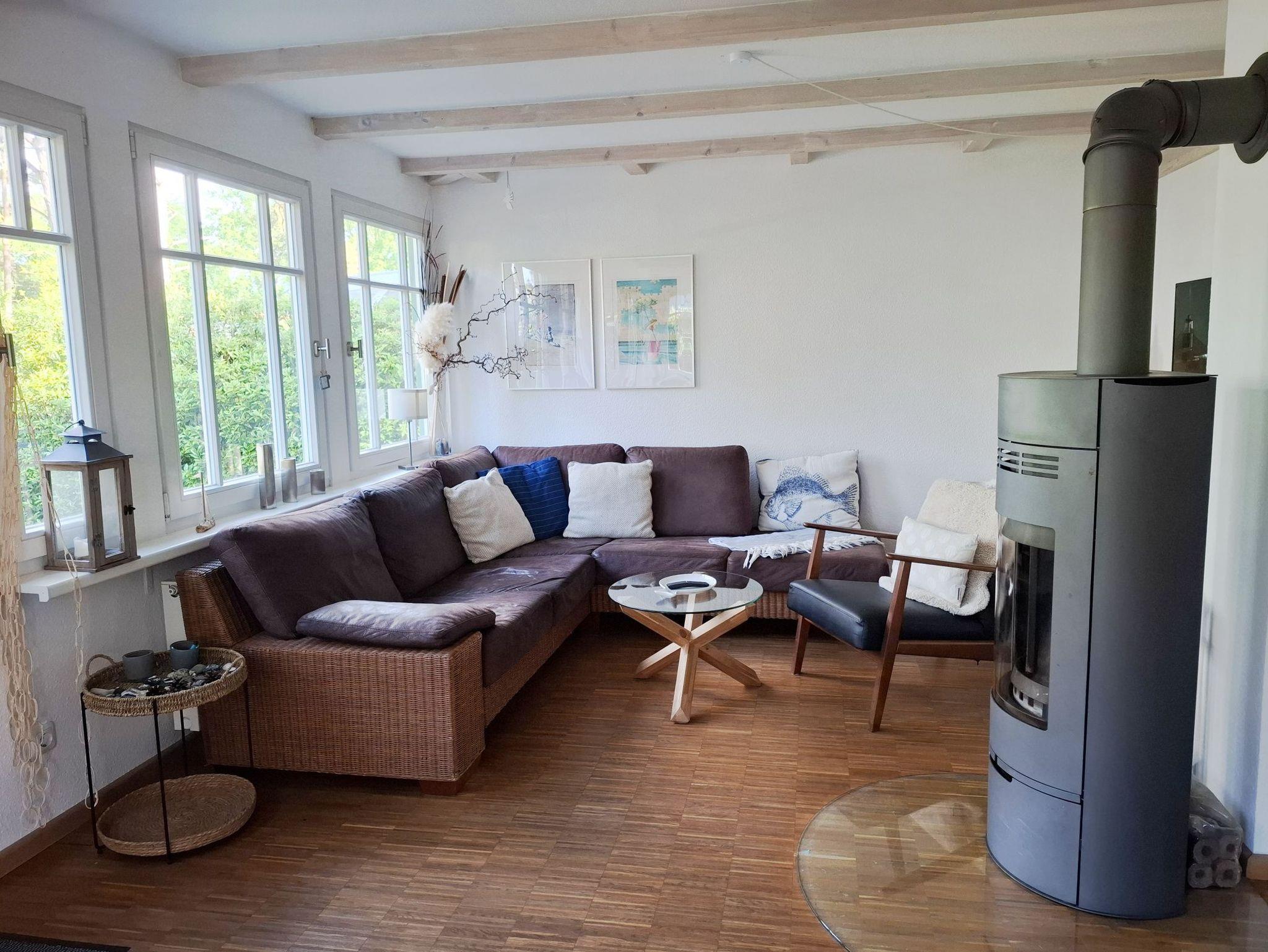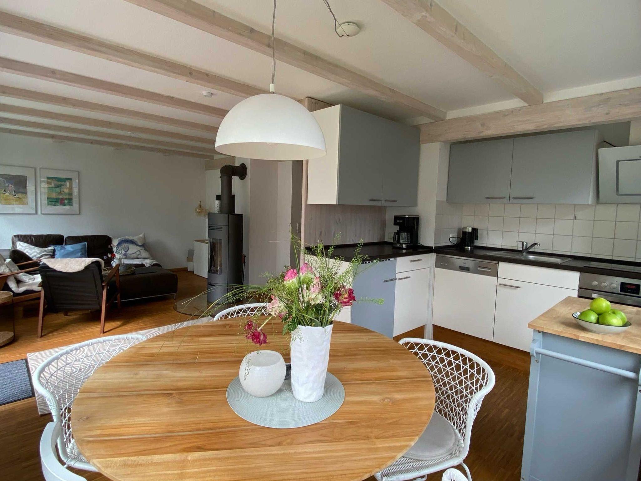 Der Wohnbereich mit großzügiger Fensterfront ist durch einen Kamin und die gemütliche Sitzecke geprägt. Am runden Esstisch aus Holz finden bis 6 Personen bequem Platz. Die offene Küche ist komplett ausgestattet mit Geschirrspüler, Kühlschrank mit Gefrierfach, Cerankochfeld und Backofen, Mikrowelle, Kaffeemaschine, Wasserkocher und Toaster.