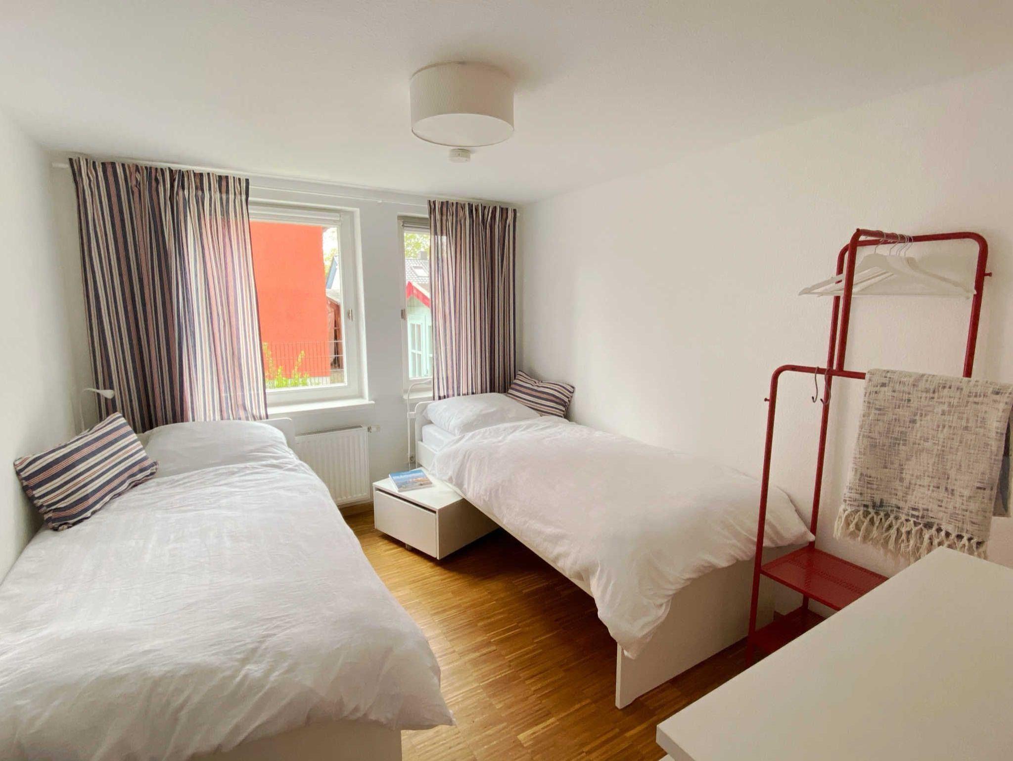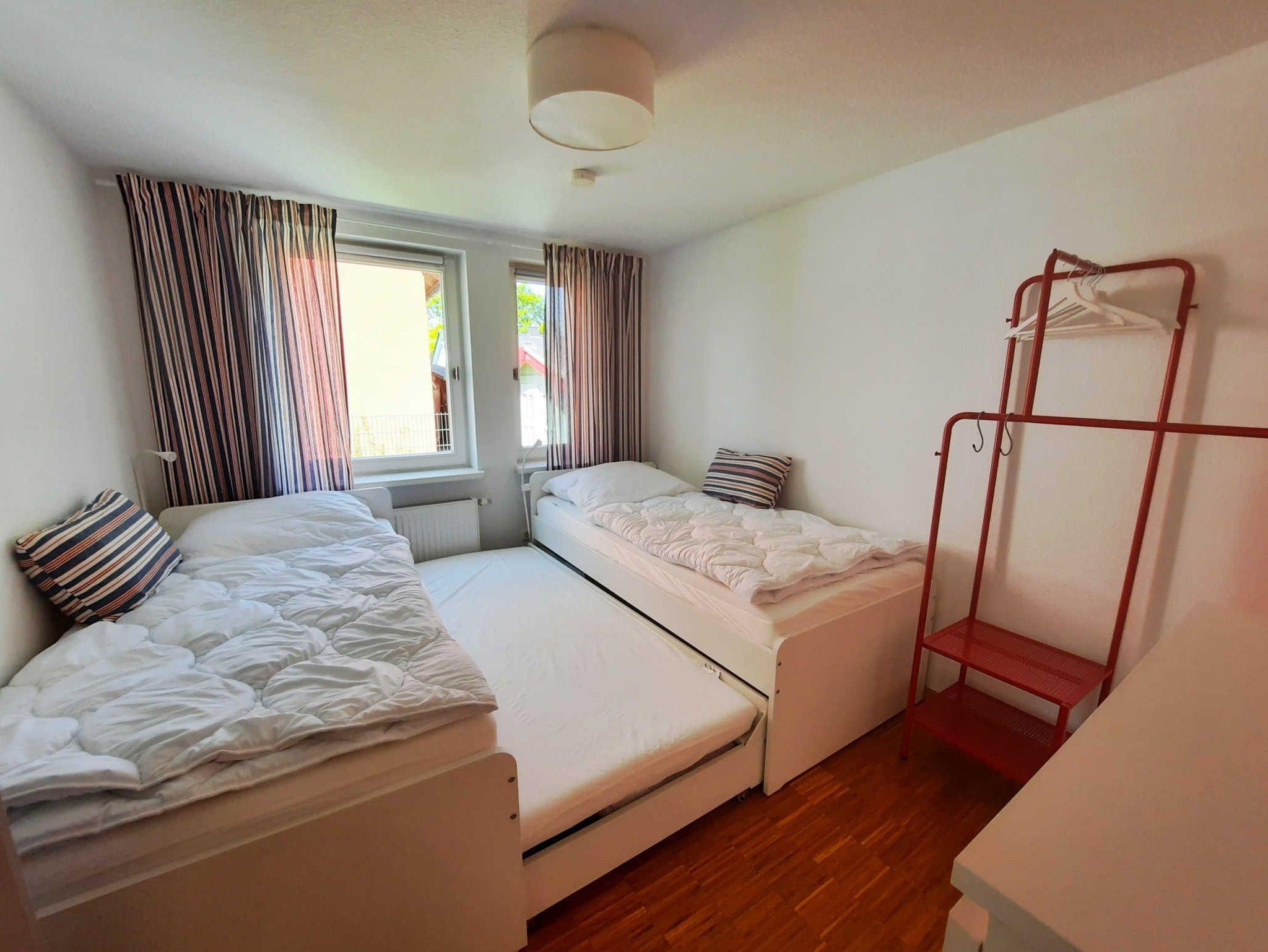 Alle Schlafgelegenheiten in den beiden Zimmern verfügen über hochwertige Federkernmatratzen und Flat-TV. In einem Schlafzimmer befindet sich ein Doppelbett (180x200cm) sowie ein Kleiderschrank. Im weiteren Schlafzimmer befinden sich zwei Einzelbetten und ein Ausziehbett mit jeweils 90x200 cm. Die Schlafräume sind mit Thermoverdunklungsrollos und Insektenschutz an den Fenstern ausgestattet.
