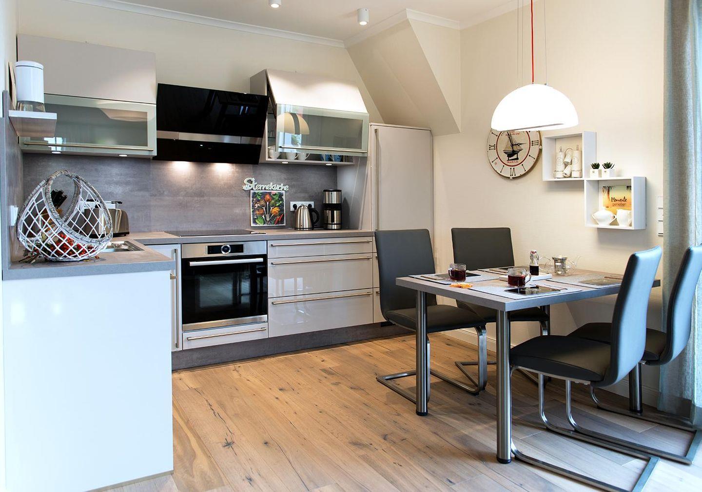 Die hochwertige Induktionsherdplatte, der Backofen, die Spülmaschine sowie Mikrowelle und Kühlschrank lassen keine Wünsche offen.