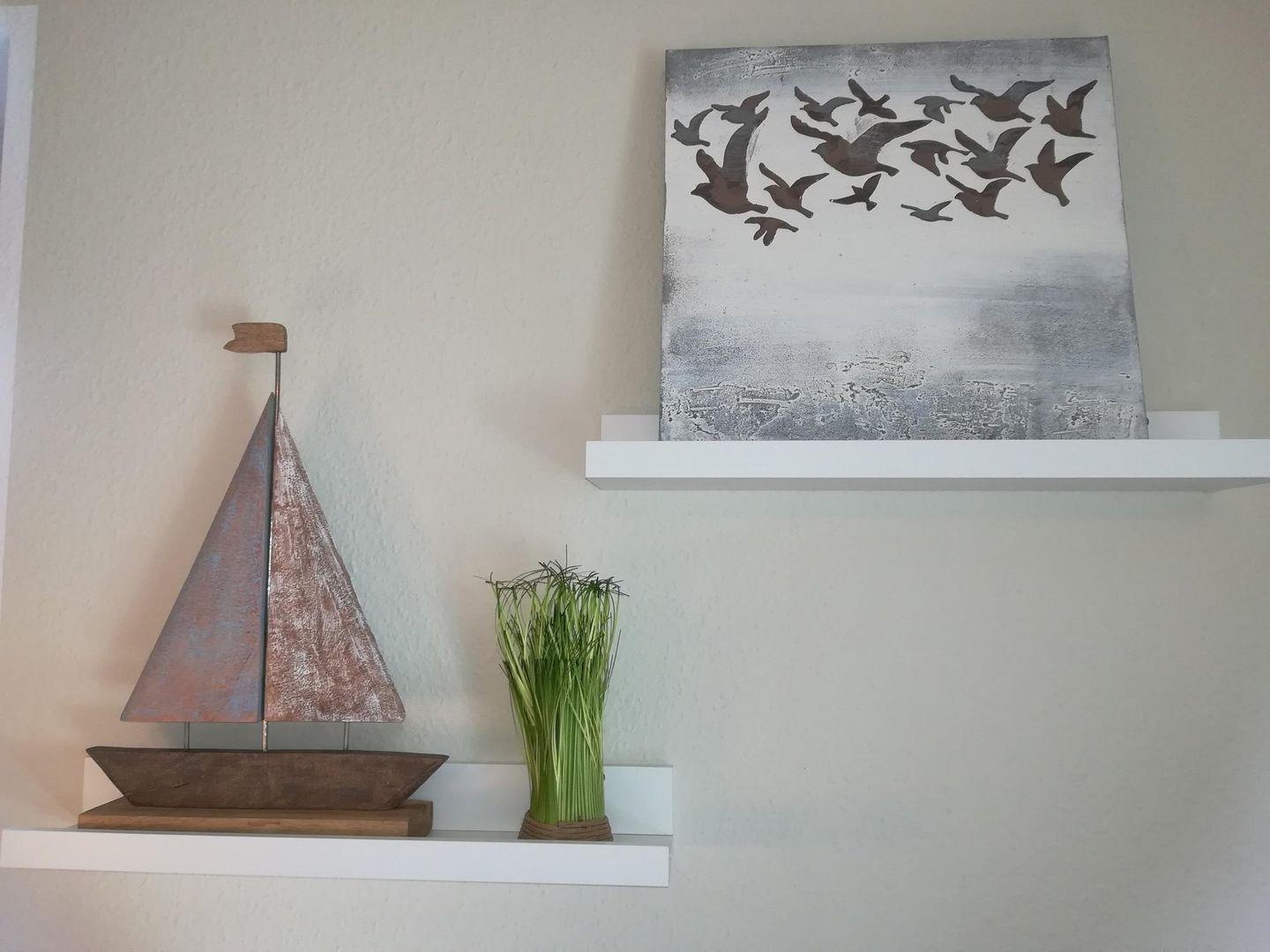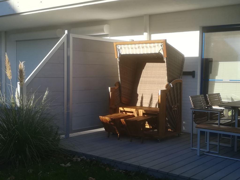 abschließbarer Fahrradschuppen, Strandkorb und große Spielwiese auf dem Grundstück. Wohn-/Esszimmer mit Küchenzeile mit Zugang zur neuen windgeschützten, voll möblierten Terrasse (Sonnenseite mit kleiner Gartenecke).