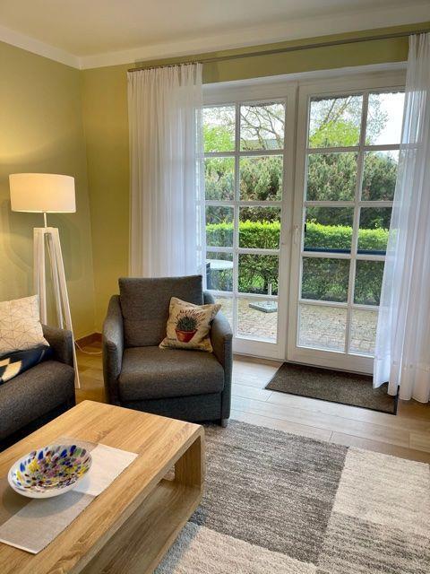 Gemütliche Ferienwohnung im Reetdachhaus nahe Ostseestrand in Zingst, mit moderner Ausstattung und Terrasse.