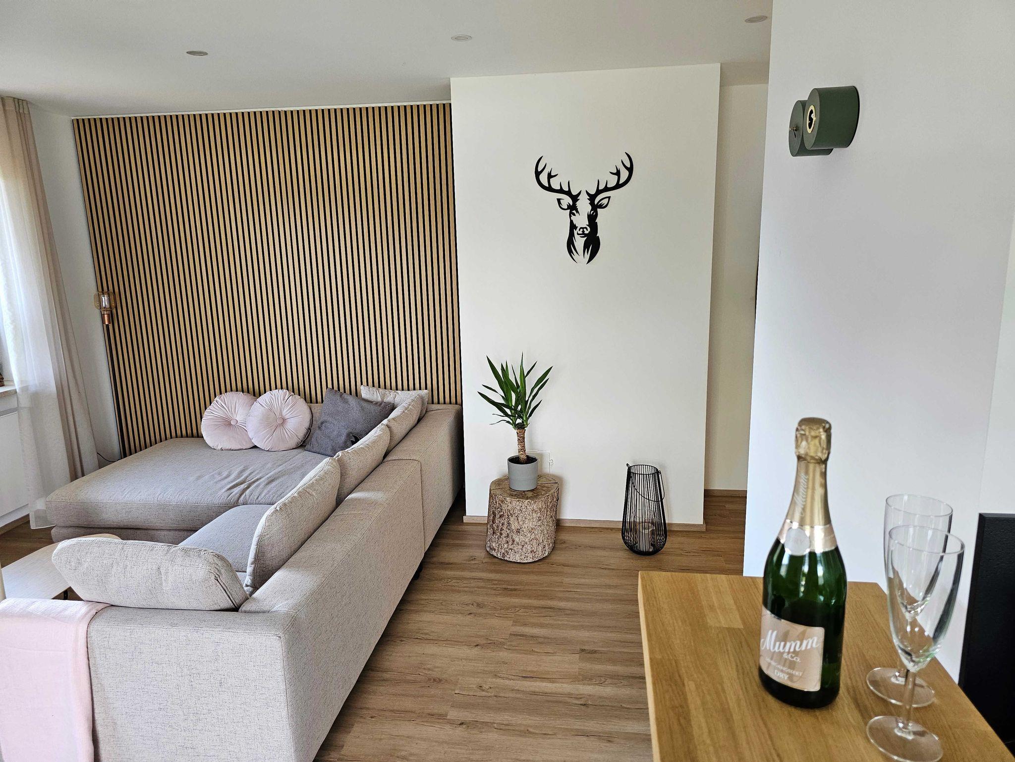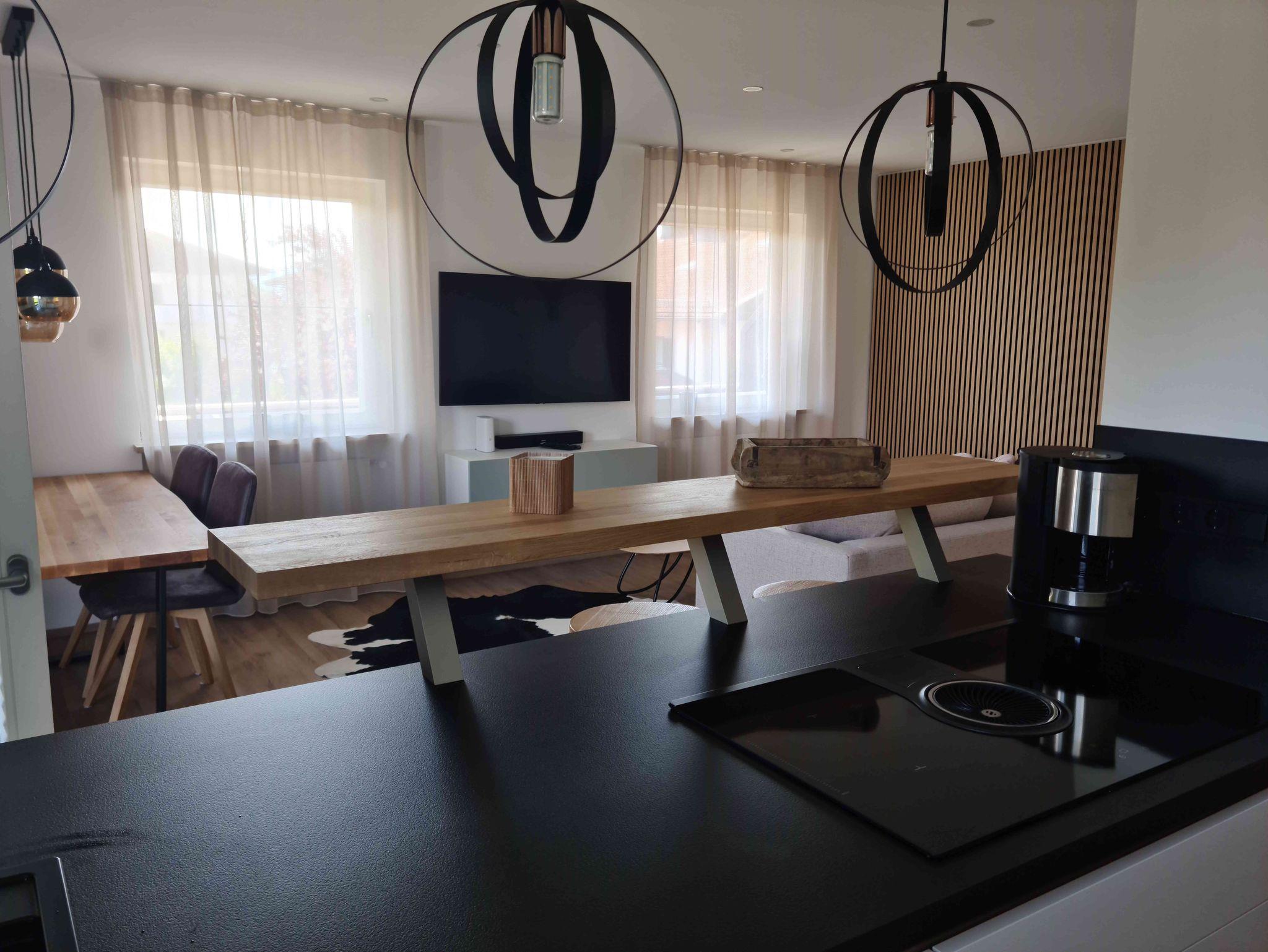 Großzügige und modern eingerichtete Ferienwohnung in ruhiger Lage. Die 80 m2 große und helle Wohnung wurde 2023 umfassend renoviert. Das Wohnzimmer mit gemütlicher Essecke und Eckcouch ist offen zur Küche und der Tresen mit Barhockern lädt zum gemeinsamen Kochen ein. Die Küche ist ausgestattet mit Backofen mit integrierter Mikrowelle, Spülmaschine, Kaffeemaschine, Espressomaschine, Toaster, Wasserkocher.Das Wohnzimmer verfügt über einen großen Flachbildfernseher, selbstverständlich mit lnternetanschluss. Einen weiteren Flachbild TV für Internet Fernsehen gibt es im gemütlichen Schlafzimmer, das mit einem Boxspringbett 180 x 200 mit festen Matratzen und einem Etagenbett 80 x 200 ausgestattet ist. Der breite Flur mit großem Kleiderschrank führt in das moderne Badezimmer, das über eine Walk in Dusche mit Rainshower verfügt. Ausreichend Haken und Ablageflächen sowie ein Föhn sind r weitläufige Süd-Ost Balkon verfügt über einen Tisch mit Stühlen und zwei Liegestühle, von dem aus man zwischen schönen Bäumen ein paar Bergspitzen sehen kann.