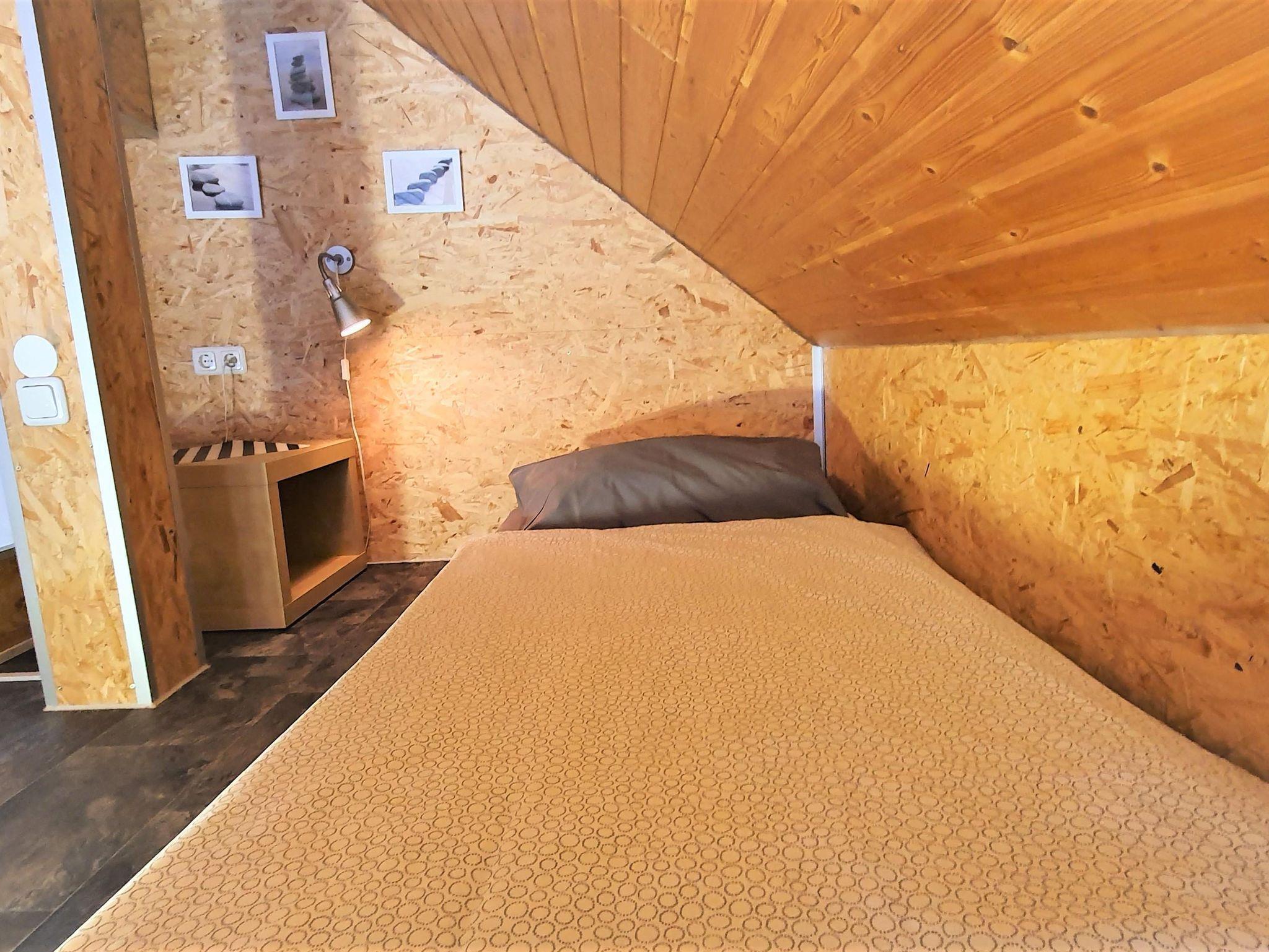 Es ist modern und gemütlich ausgestattet, im Schlafbereich befinden sich 2 Einzelbetten (90x200cm) Nachttisch und ein Kleiderschrank. Über eine Leiter gelangt man zu einem Hochbett.