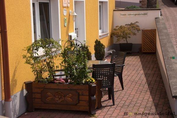 Vor der Ferienwohnung, haben wir für Sie einen Freisitz / Terrasse geschaffen, von wo aus Sie eine offene Aussicht ins Nimstal haben. Dort kann man hervorragend in der Abendsonne seine verdiente Brotzeit, genießen.