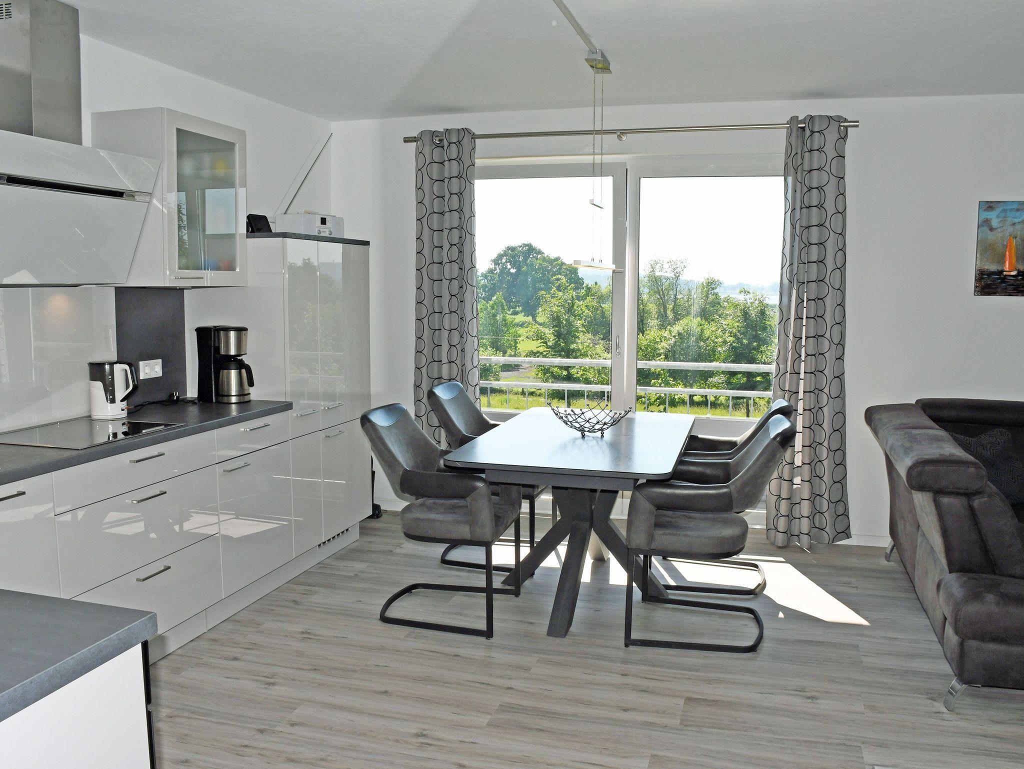 Unser Ferienappartement Mönchgut ist ca. 54 qm groß, hat Platz für maximal 2 Gäste zzgl. einem Kind bis 12 Jahren und wurde sehr liebevoll, modern und komfortabel eingerichtet. Über einen separaten Eingang gelangt man über den Flur in die erste Etage des Appartements Mönchgut. Im großzügigen Wohnraum befinden sich eine Sitzcouch mit Tisch und Sessel, ein modernes Flachbild-TV-Gerät sowie eine Musikanlage. Hier steht auch ein großer Esstisch mit Sitzgelegenheiten. Durch die großen Panoramafenster haben Sie einen sehr schönen Ausblick in die umliegende Natur. Die moderne Küchenzeile ist mit einem Herd, Backofen, Abzugshaube, Geschirrspülmaschine, Wasserkocher, Kaffeemaschine, Toaster und Kühlschrank komplett ausgestattet.