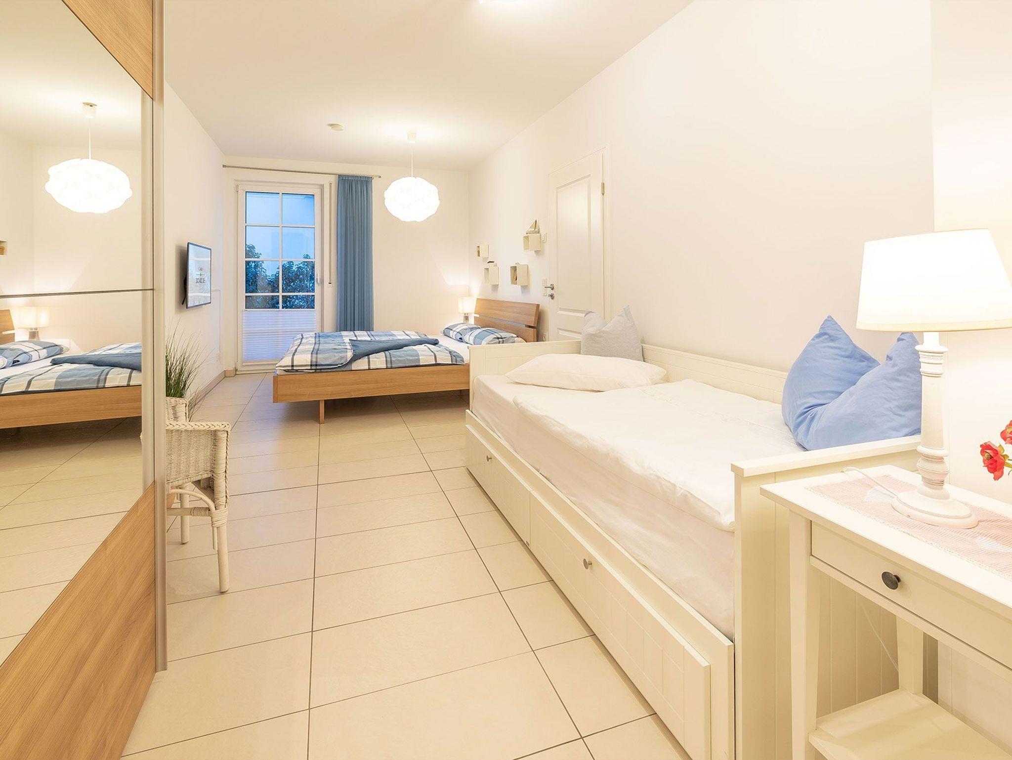 Das Schlafzimmer überzeugt mit einem komfortablen Doppelbett (180x200 cm), sowie einem zusätzlichen Einzelbett (Möglichkeit zur Aufbettung, ausziehbar auf 140x200 cm). Für einen erholsamen Schlaf und einen guten Start in den Tag, haben Sie die Möglichkeit durch Plissees und Rollladen das Zimmer zu verdunkeln.