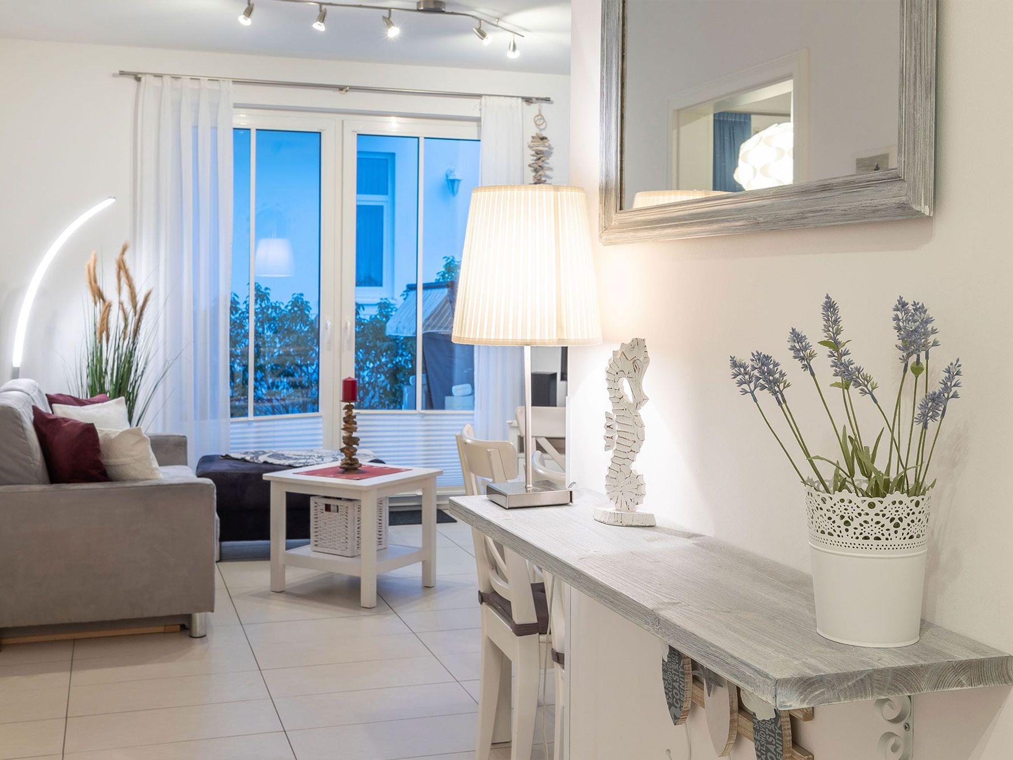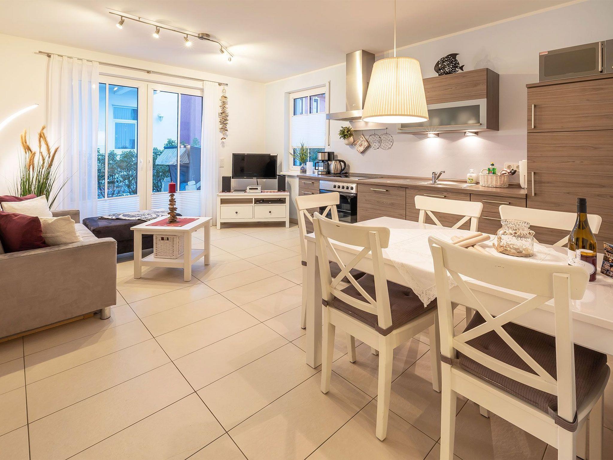 Ein Urlaubstraum auf stolzen 56 qm erwartet Sie in der Villa Annika, mit einem ganz besonderen Charme. Der Mittelpunkt Ihrer Ferienwohnung ist der Wohn- und Essbereich mit einer perfekt ausgestatteten Küchenzeile, einem direkten Zugang zur Terrasse und einem wohnungseigenen Strandkorb. Hier können Sie Ihr Glas Wein in der Abenddämmerung genießen.
