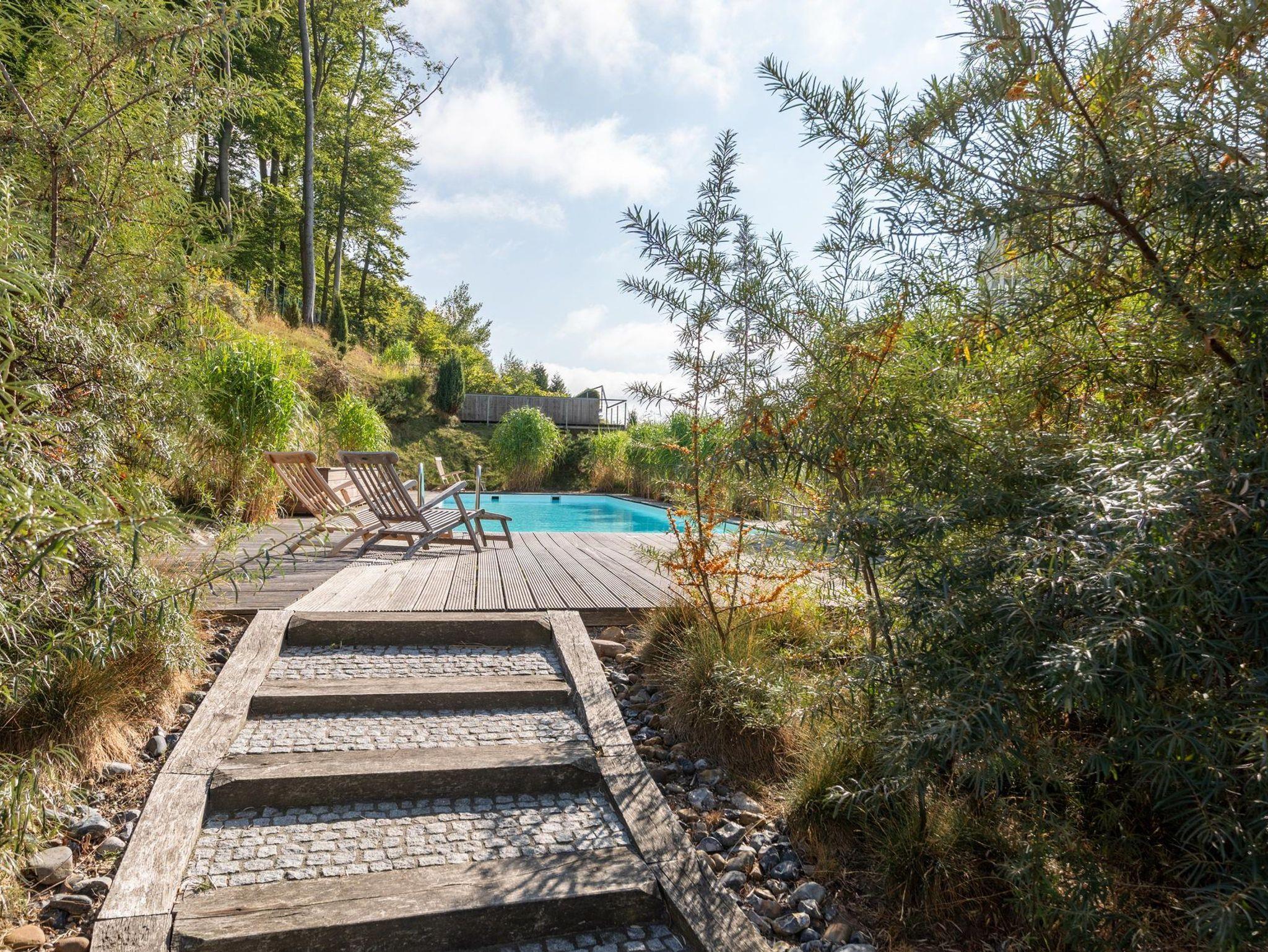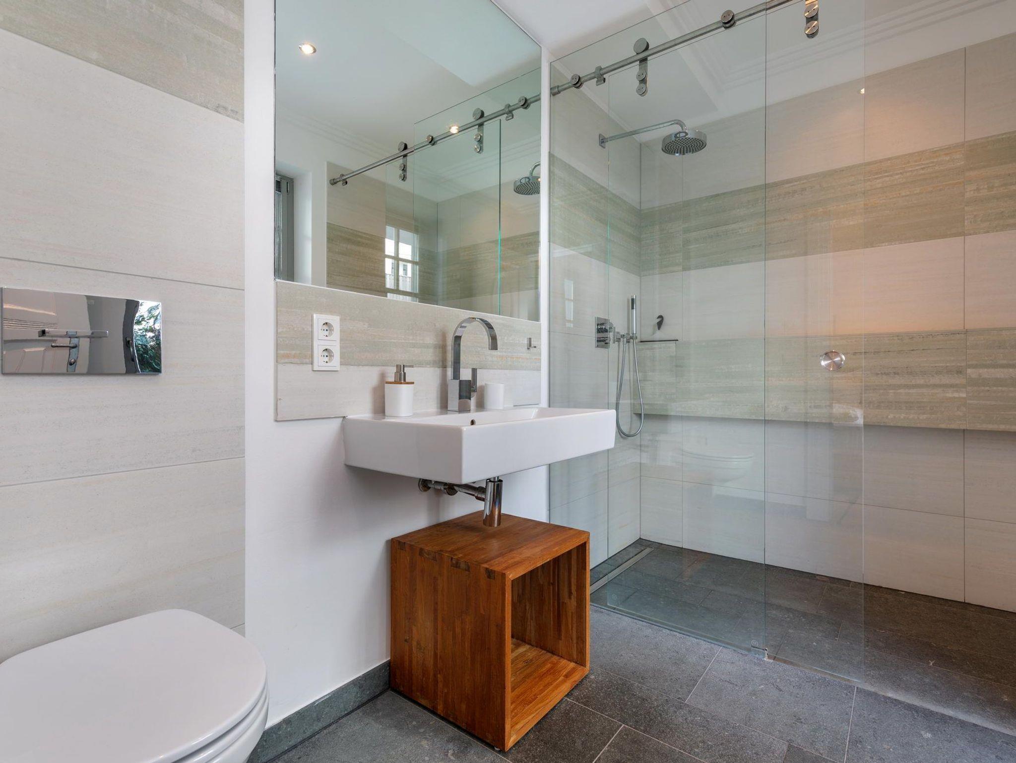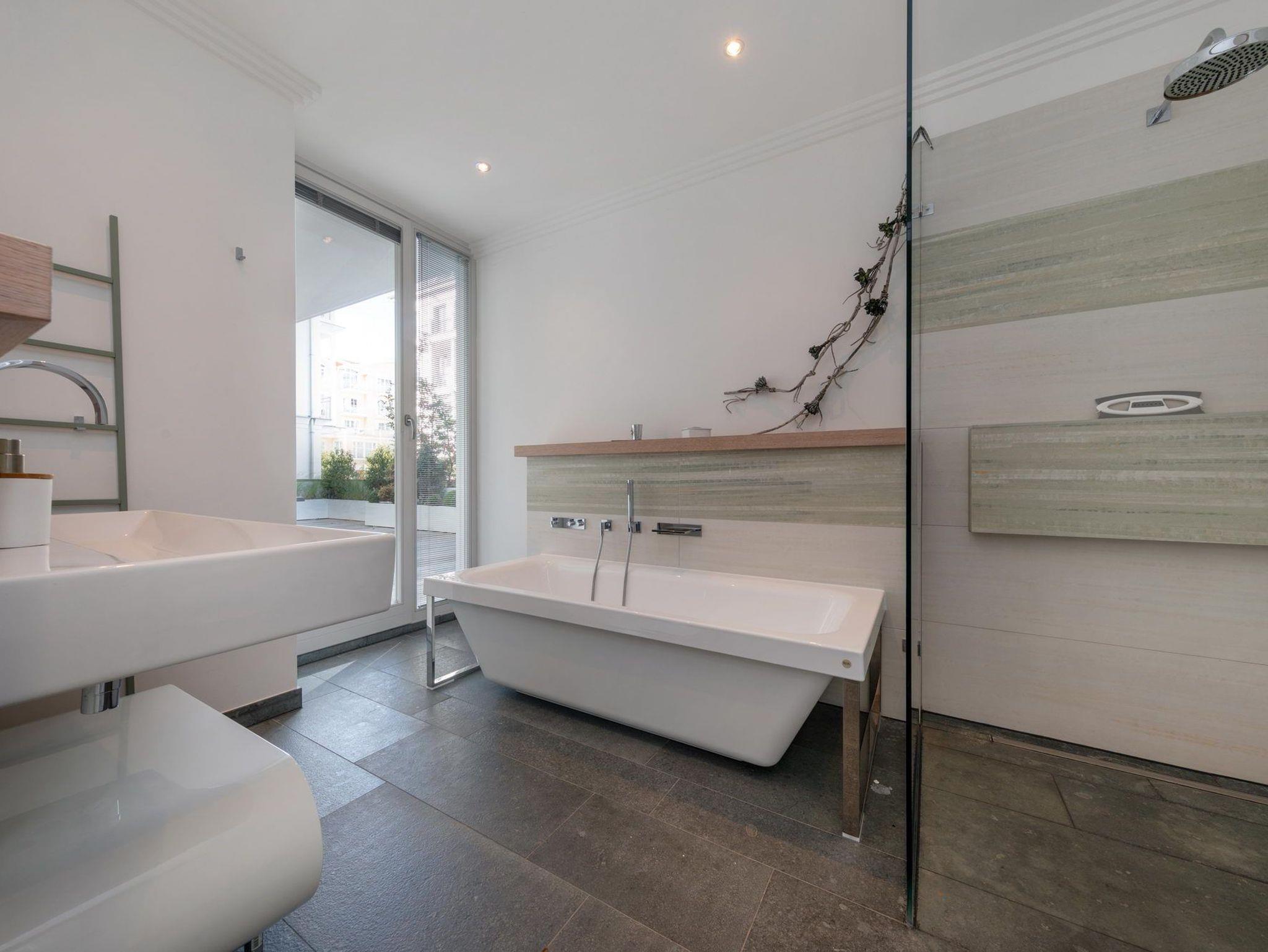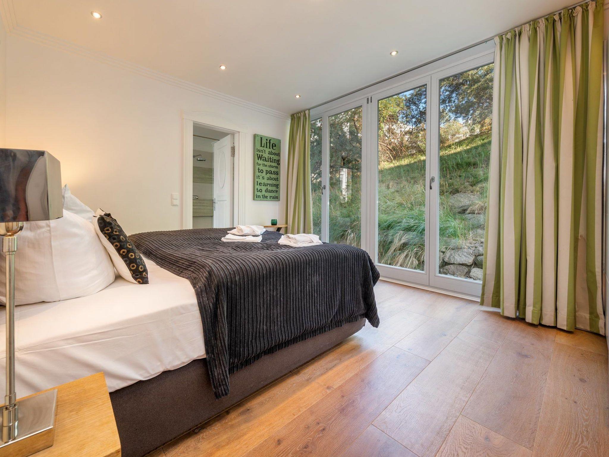 Gleich drei Schlafzimmer mit luxuriösen Boxspring-Doppelbetten, Kleiderschrank und Flat-TV strahlen elegante Behaglichkeit aus. Die bodentiefen Fenster können aber selbstverständlich verdunkelt werden, damit Sie stets erholsamen Schlaf finden. Dem Schlafzimmer angeschlossen ist jeweils ein Ensuite-Bad mit Villeroy [&] Boch- Waschbecken mit Dornbracht Armaturen, WC und großzügiger, ebenerdiger Dusche bzw. Badewanne. Ein separates Gäste-WC im Eingangsbereich ist ebenfalls vorhanden.