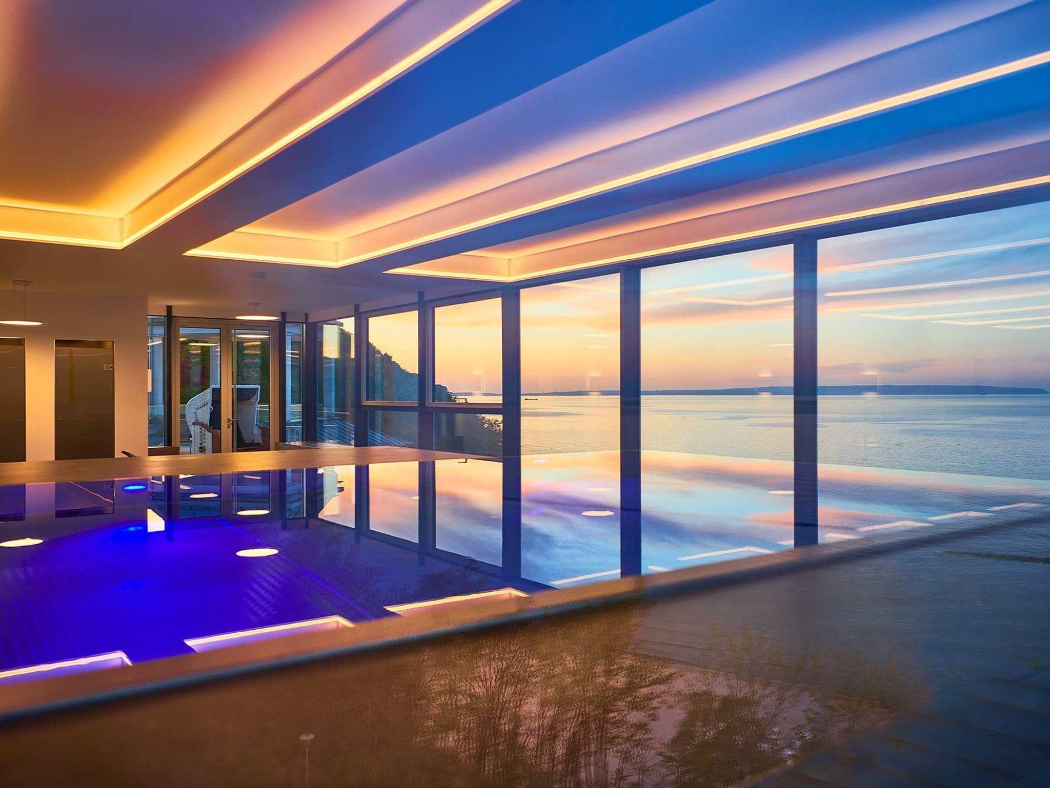 Die Gäste des Hauses haben die Möglichkeit, den exklusiven Wellnessbereich, mit zwei Saunen und einem 29 Grad warmen Pool zu nutzen. Vom 5. Stock des Hauses aus genießen Sie einen einzigartigen, wunderschönen Panoramablick auf die traumhafte Ostsee, die Kreidefelsen und die Seebrücke Sellin.