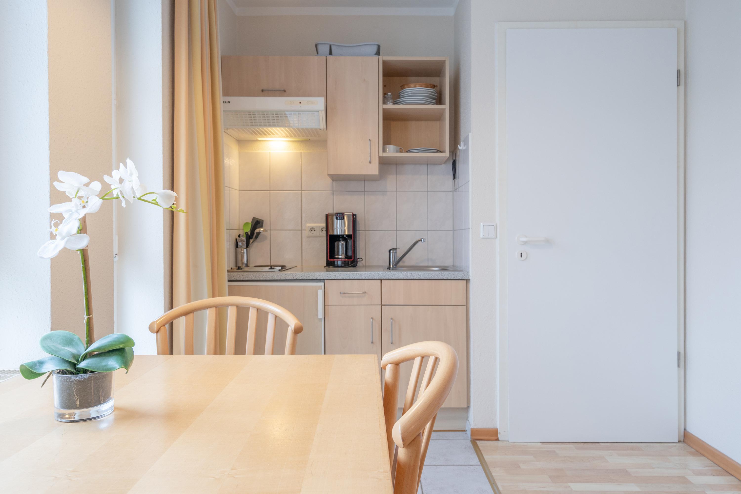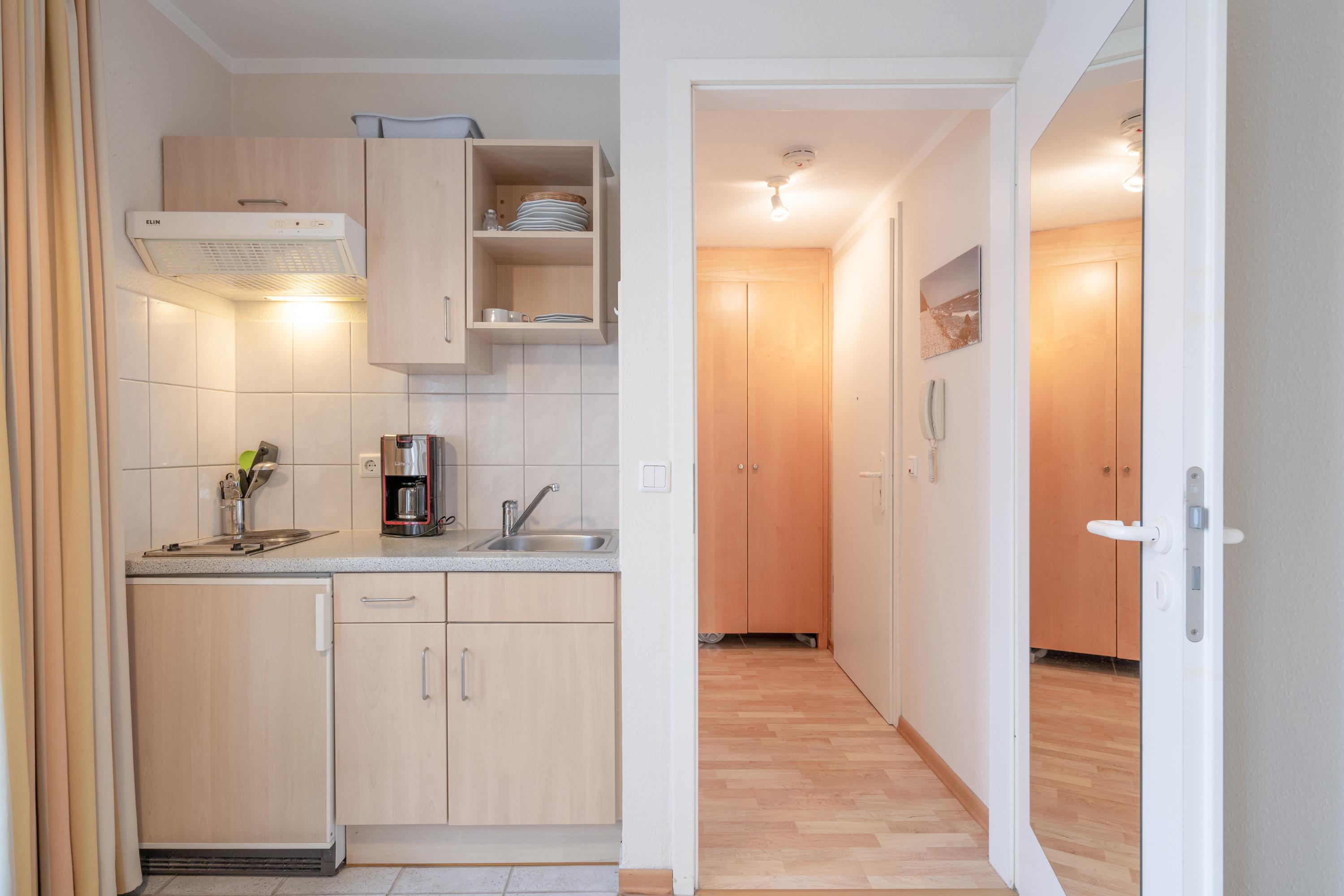 Die Ferienwohnung verfügt über kostenfreies WLAN und die Erstausstattung an Bettwäsche ist inklusive. Der kombinierte Wohn-/Schlafbereich mit Verdunklung verfügt über ein Schlafsofa. Darüber hinaus verfügt die Ferienwohnung über ein Bad mit Dusche/WC und Föhn. Die voll ausgestattete Pantry mit Kaffeemaschine und Toaster lässt keine Wünsche offen. Ein Fernseher inkl. 3 Sky-Sender rundet die gute Einrichtung ab.