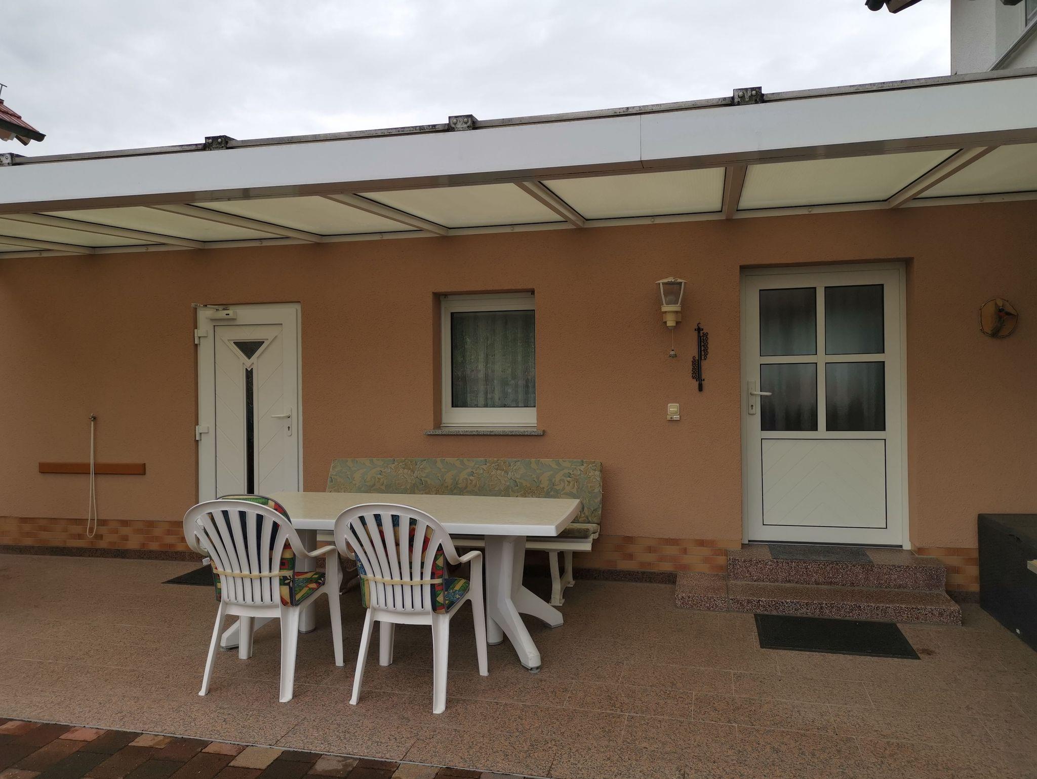 Im Außenbereich befindet ich eine überdachte Terrasse mit Sitzgelegenheiten für 4 Personen mit Grillmöglichkeit.