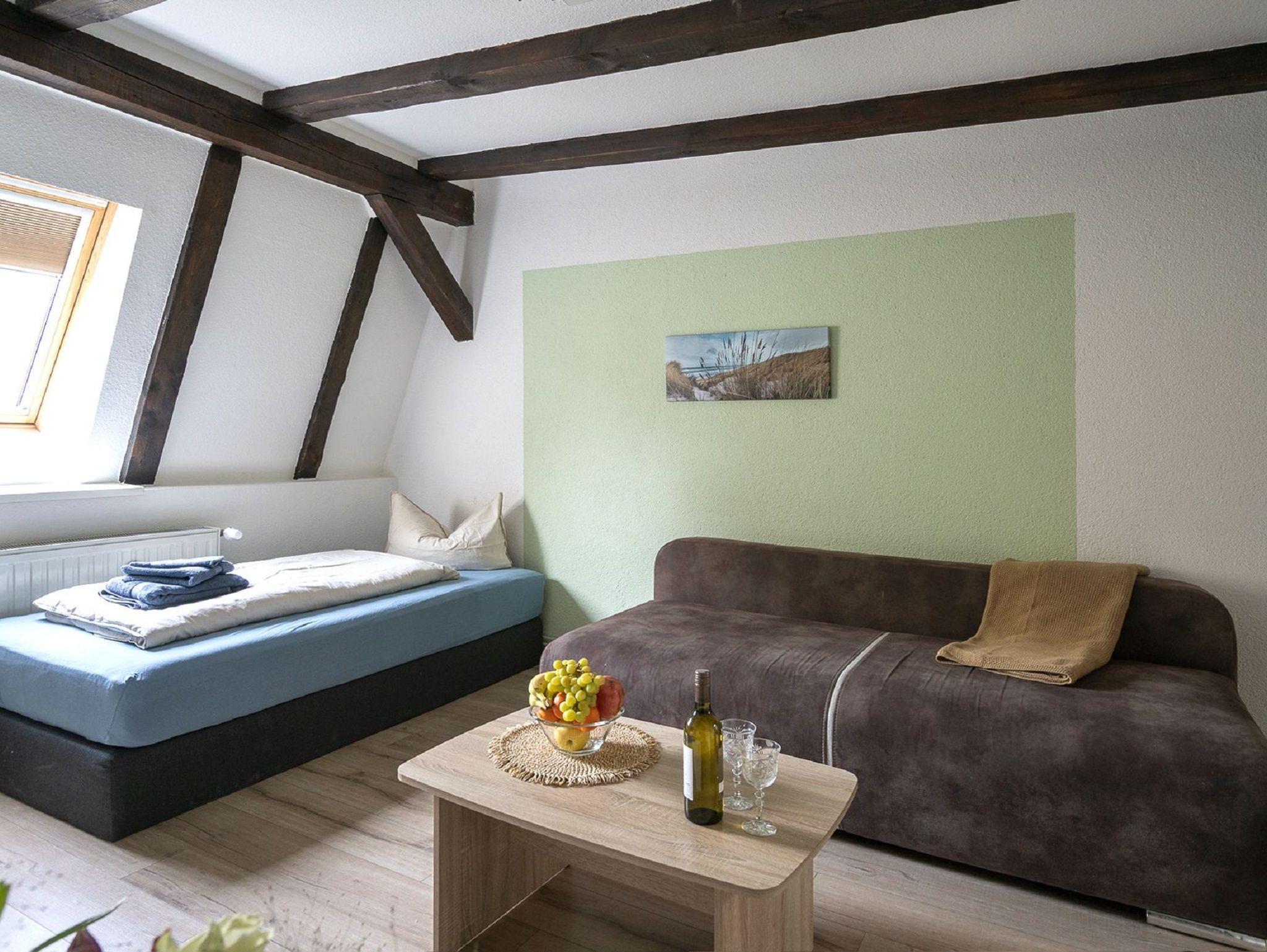 • Wohnzimmer hat eine Couch mit Schlaffunktion