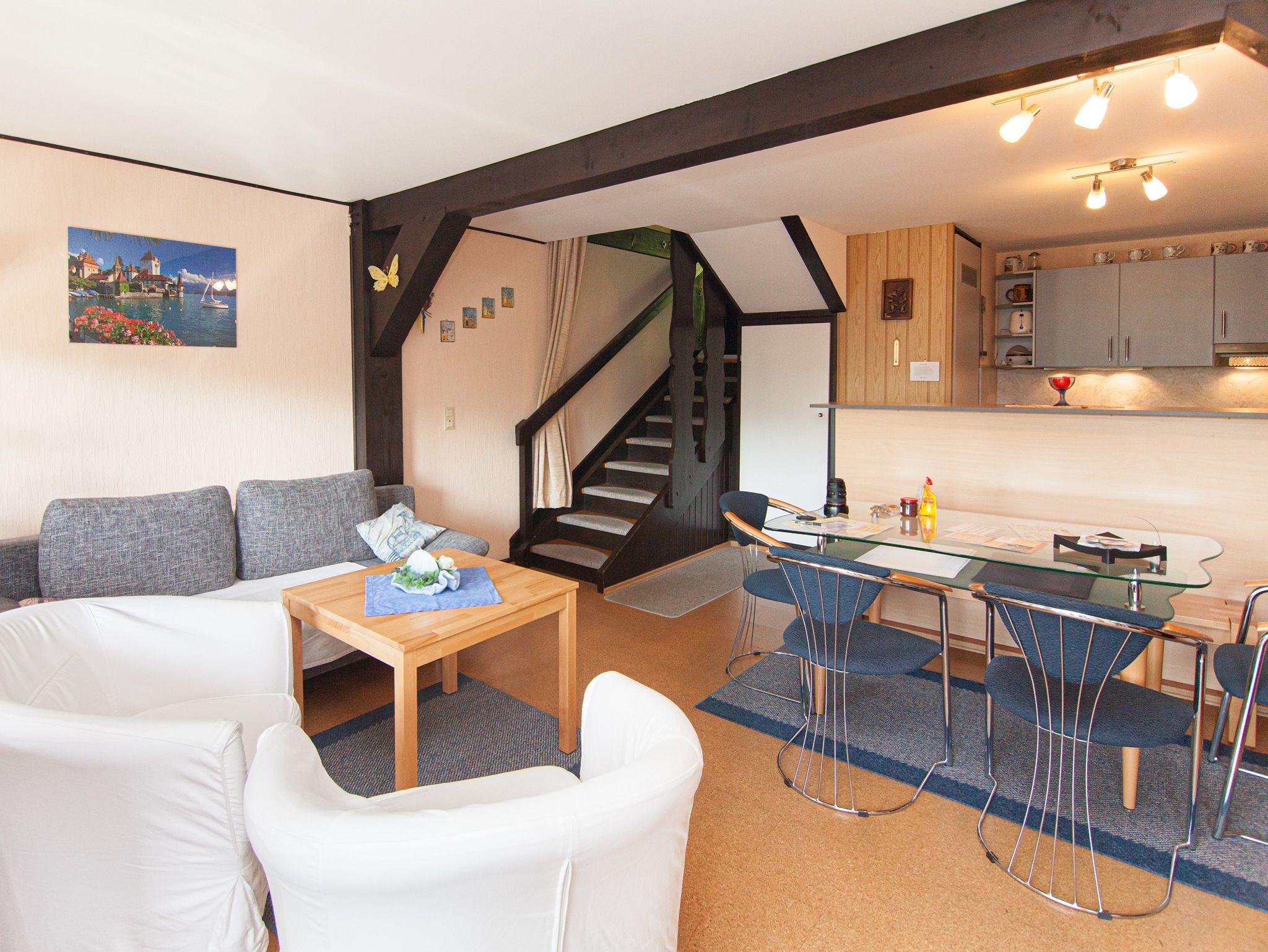 Das Appartement ist im Maisonettstil. In der Eingangsetage befindet sich das Bad. Die Schlafräume sind in der oberen Etage, in der unteren Etage der Wohnraum mit Küche. Komplett eingerichtet, für bis zu 6 Personen. Kaffeemaschine, Wasserkocher, Toaster, Mikrowelle, Kinderbett, Kinderhochstuhl, Kindersicherung am oberen Treppenabsatz, Radio, Sat-TV. Alle Betten sind in Komforthöhe (kniehoch), das Doppelbett im Schlafzimmer ist in Übergröße ( 2 x 2,20 m). Wohnfläche ca. 78 qm², Südbalkon mit Möbeln. Wohnraum mit Couchecke und Essplatz, Küchenzeile, Küchenbar.