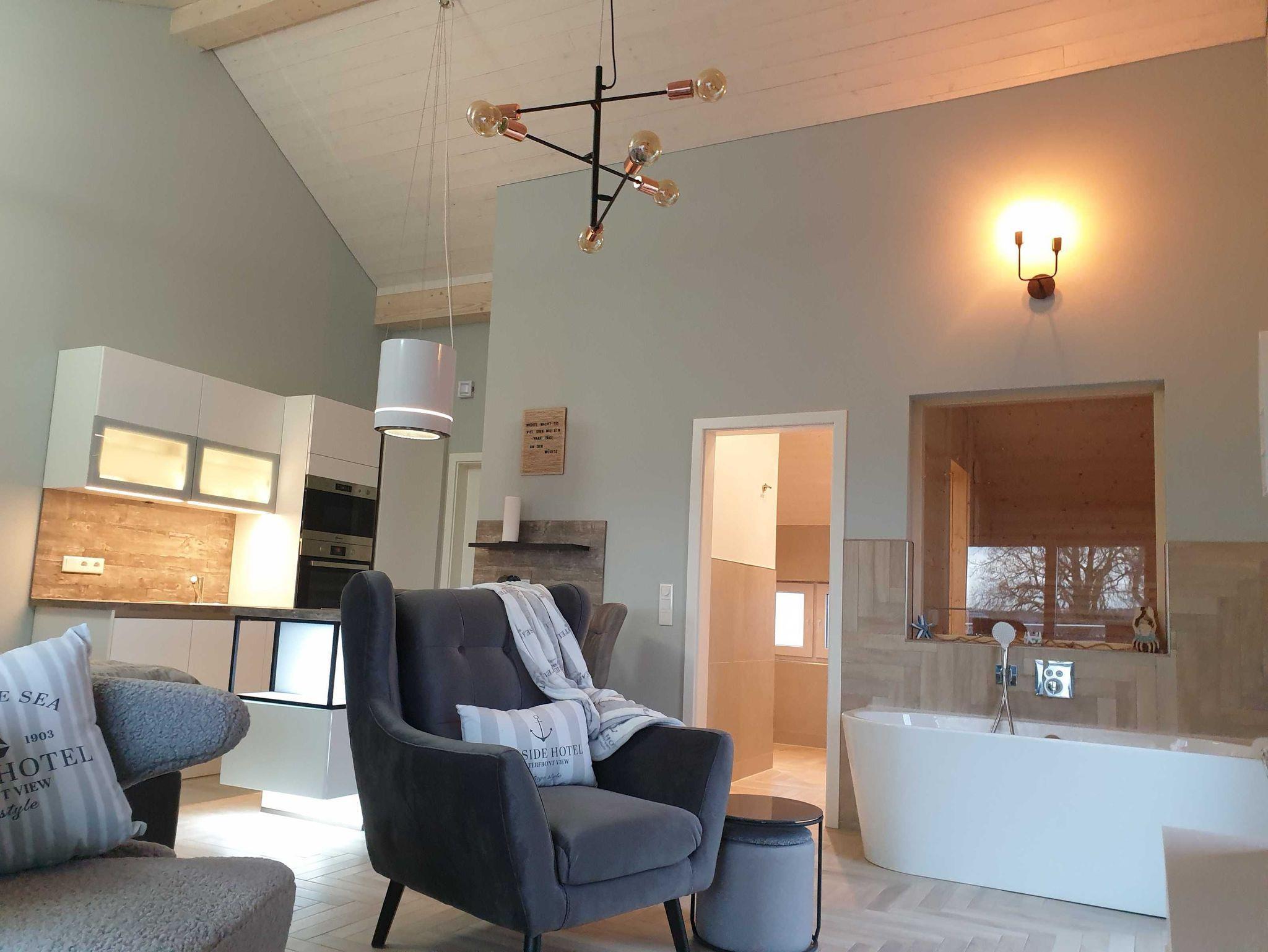 Erleben Sie Luxus und ein sicheres Gefühl in der eigenen Sauna, behagliche Wärme am modernen Gaskamin oder ein Entspannungsbad in der im Wohnraum integrierten Badewanne. Ob einfach nur Musik hören, einen Film genießen oder direkt aus der Badewanne in die Natur und auf den See schauen.