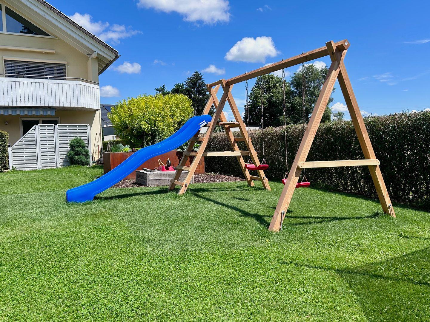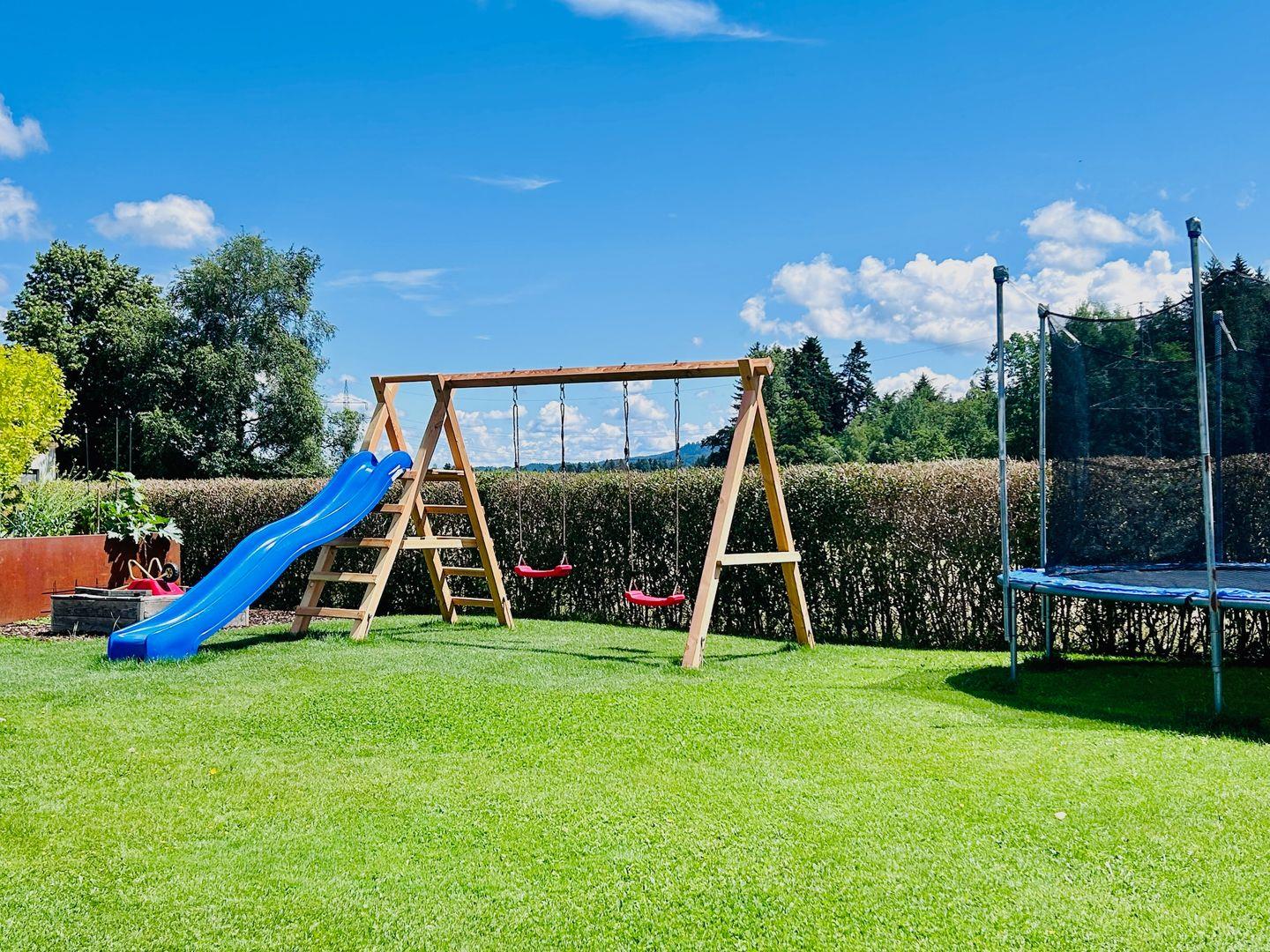 Eine großzügig überdachte Terrasse lädt zum gemütlichen Grillabend mit dem vorhandenen Holzkohlegrill ein. Kinder werden sich in Ihrem Feriendomizil mit Spielgerüst, Trampolin und großem Garten wohlfühlen.