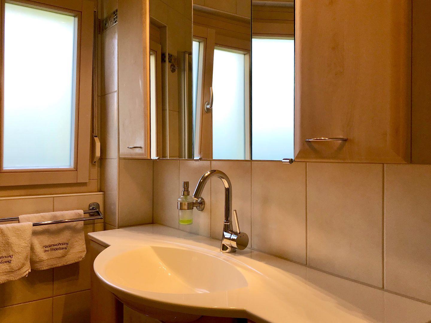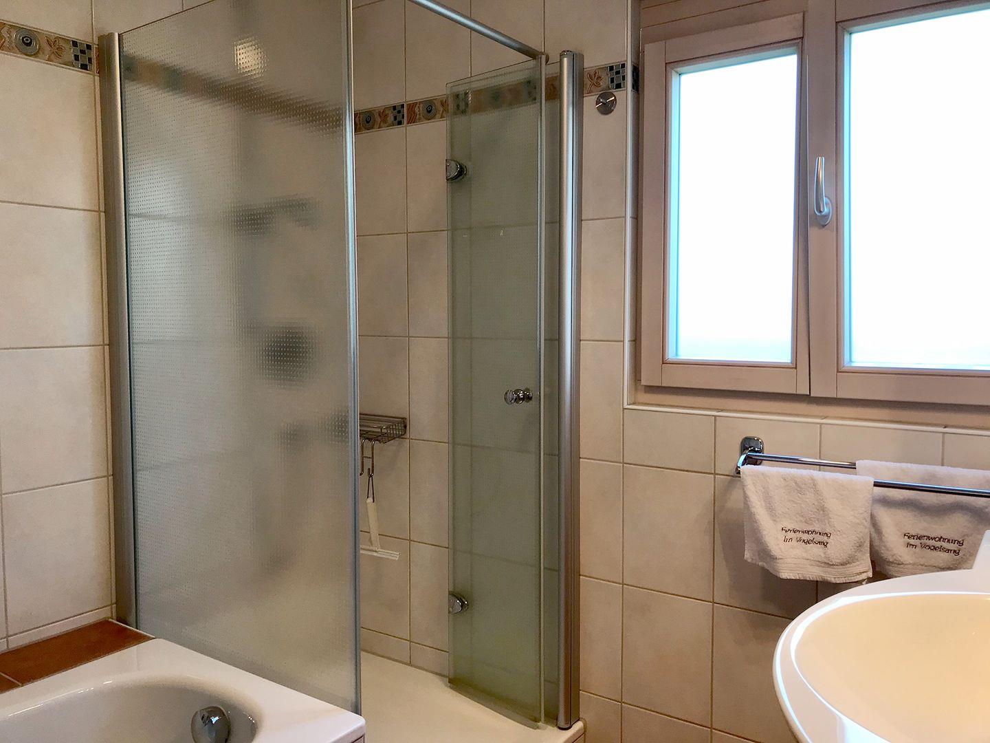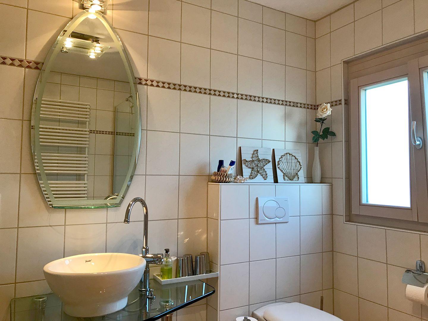 In der Wohnung befindet sich ein Bad mit Dusche und Badewanne sowie eine separate Toilette. Bei einer Belegung von mehr als vier Personen stellen wir Ihnen gerne ein zweites Bad mit Dusche und WC zur Verfügung.