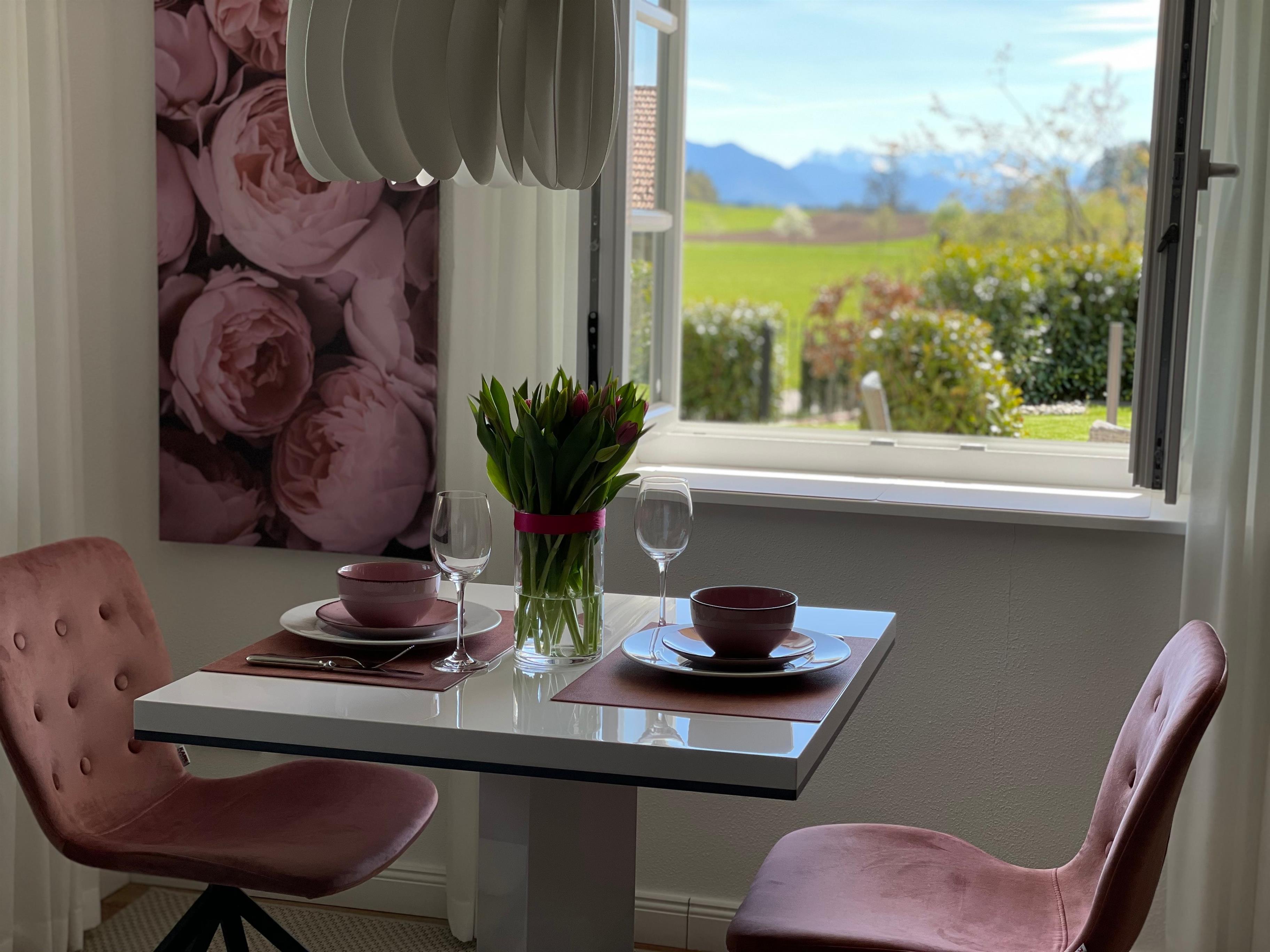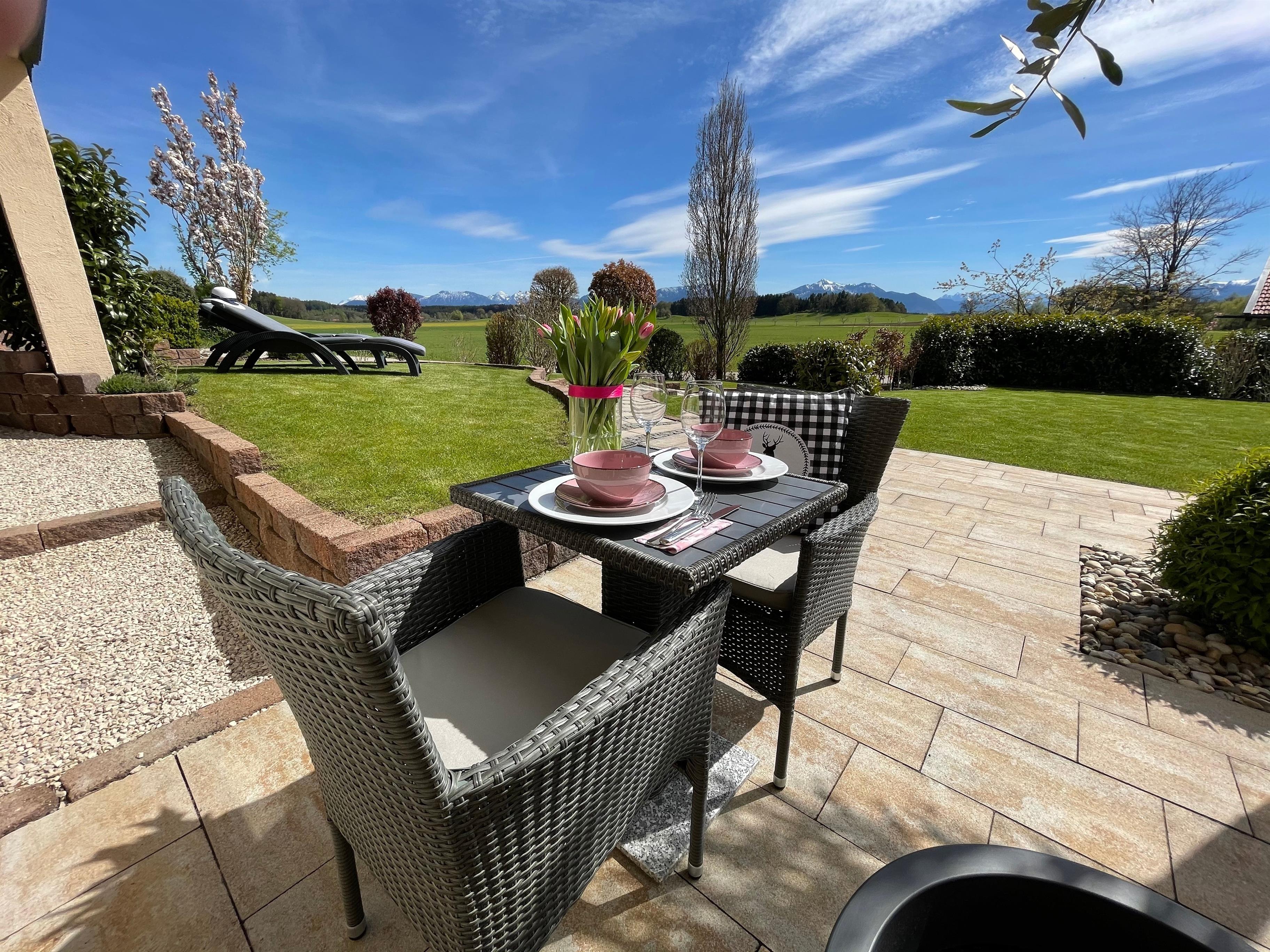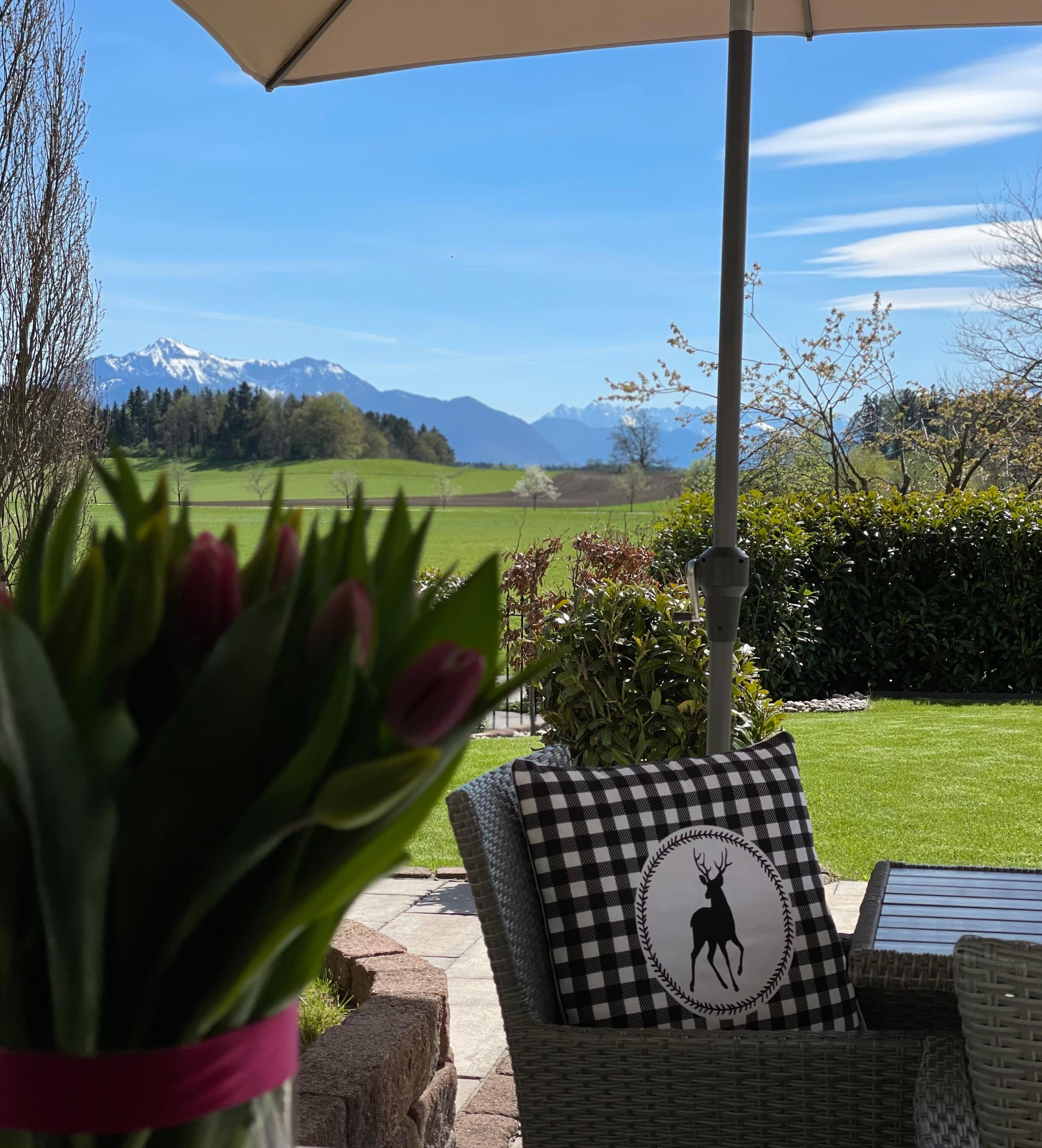 mit herrlichem Blick auf die umliegenden Berge, wie bspw. dem Wilden Kaiser, Hochgern, Hochfelln, Kampenwand und Watzmann. Je nach Wetter, Blüten-/Blätterstand können Sie dies täglich geniessen.