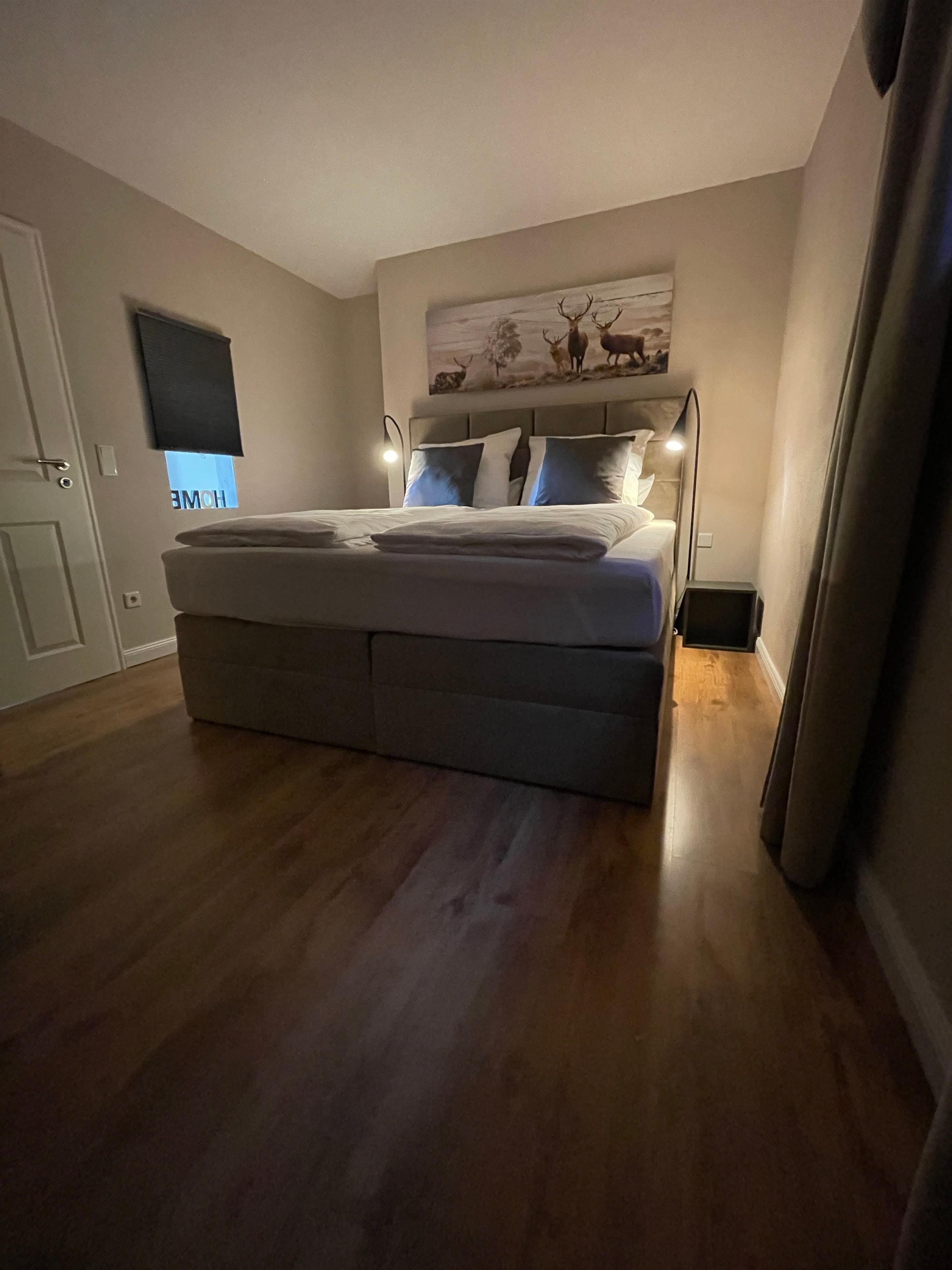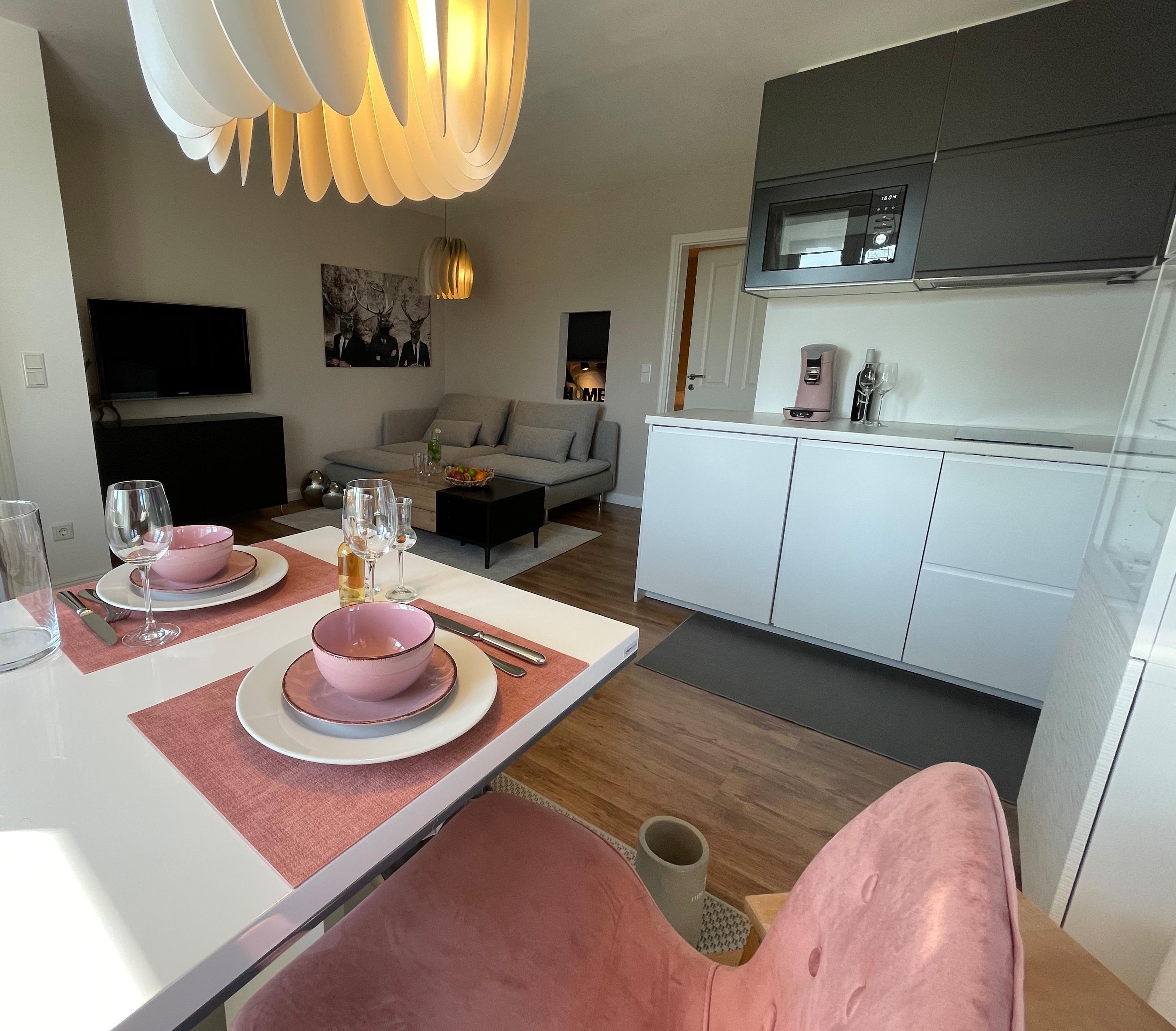 Ein großzügiger und heller Wohnbereich mit Couch, Flach-TV, Küchenzeile (inkl. Geschirrspüler, Cerankochfeld, Dunstabzug, Mikrowelle) und Esstisch. Ein separates Schlafzimmer mit Boxspring-Doppelbett (1,80 x 2,00m) bietet einen erholsamen Schlaf. Im Badezimmer befindet sich eine Dusche, WC, Fön und Spiegelschrank.