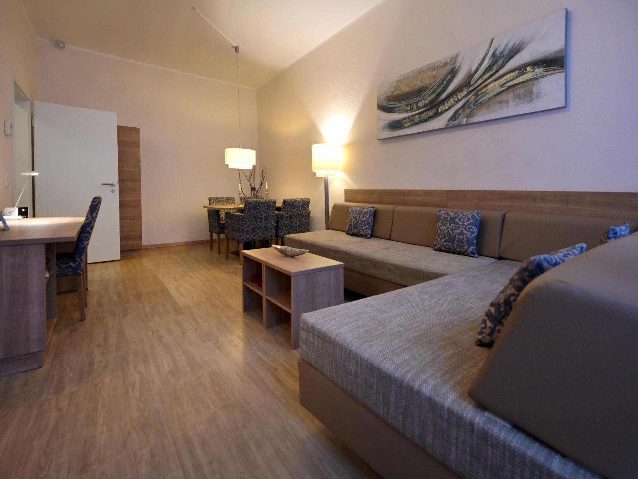 • Wohnbereich mit großer Couch (umfunktionierbar in zwei hochwertige Boxspring-Einzelbetten je 90 x 200 cm), 43 Smart Internet SAT-TV mit HDMI-Anschluss, Stereoanlage mit CD und USB-Anschluss, Schreibtisch, Esstisch für 4 Personen