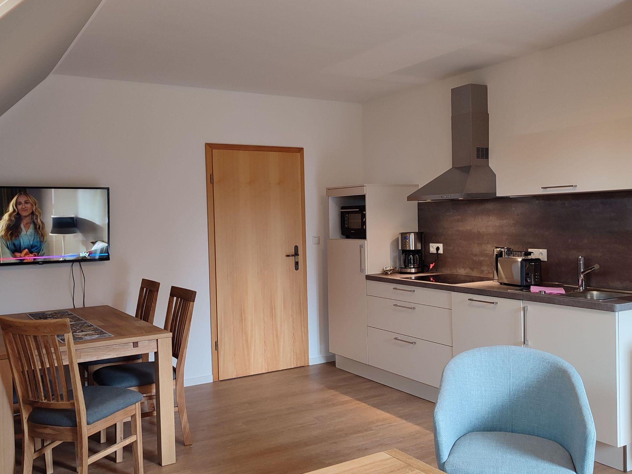 Genießen Sie Hilde, ein großzügiges Zwei-Raum-Apartment im Dachgeschoss mit ca. 52 qm für 2 bis 5 Personen. Entspannen Sie im großzügigen Wohnzimmer mit ausziehbarem Schlafsofa, TV/WLAN und großem Esstisch. Die gut ausgestattete Küchenzeile, das Schlafzimmer mit Doppelbett und Einzelbett sowie das moderne Badezimmer mit Dusche machen Ihren Aufenthalt besonders angenehm. Der kleine Balkon nach Südwest lädt zum Verweilen ein. Haustiere sind im Dachgeschoss nicht erlaubt.