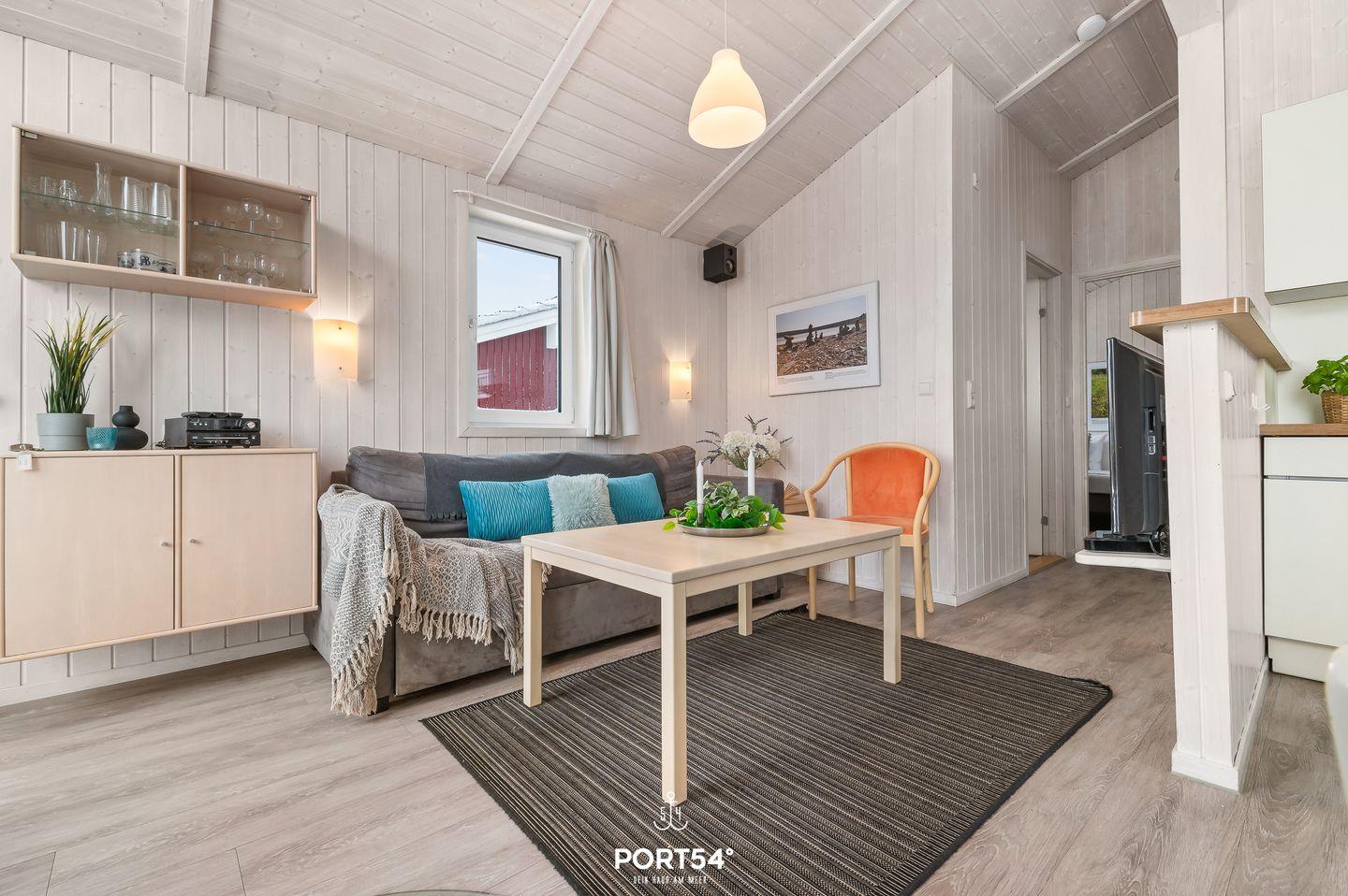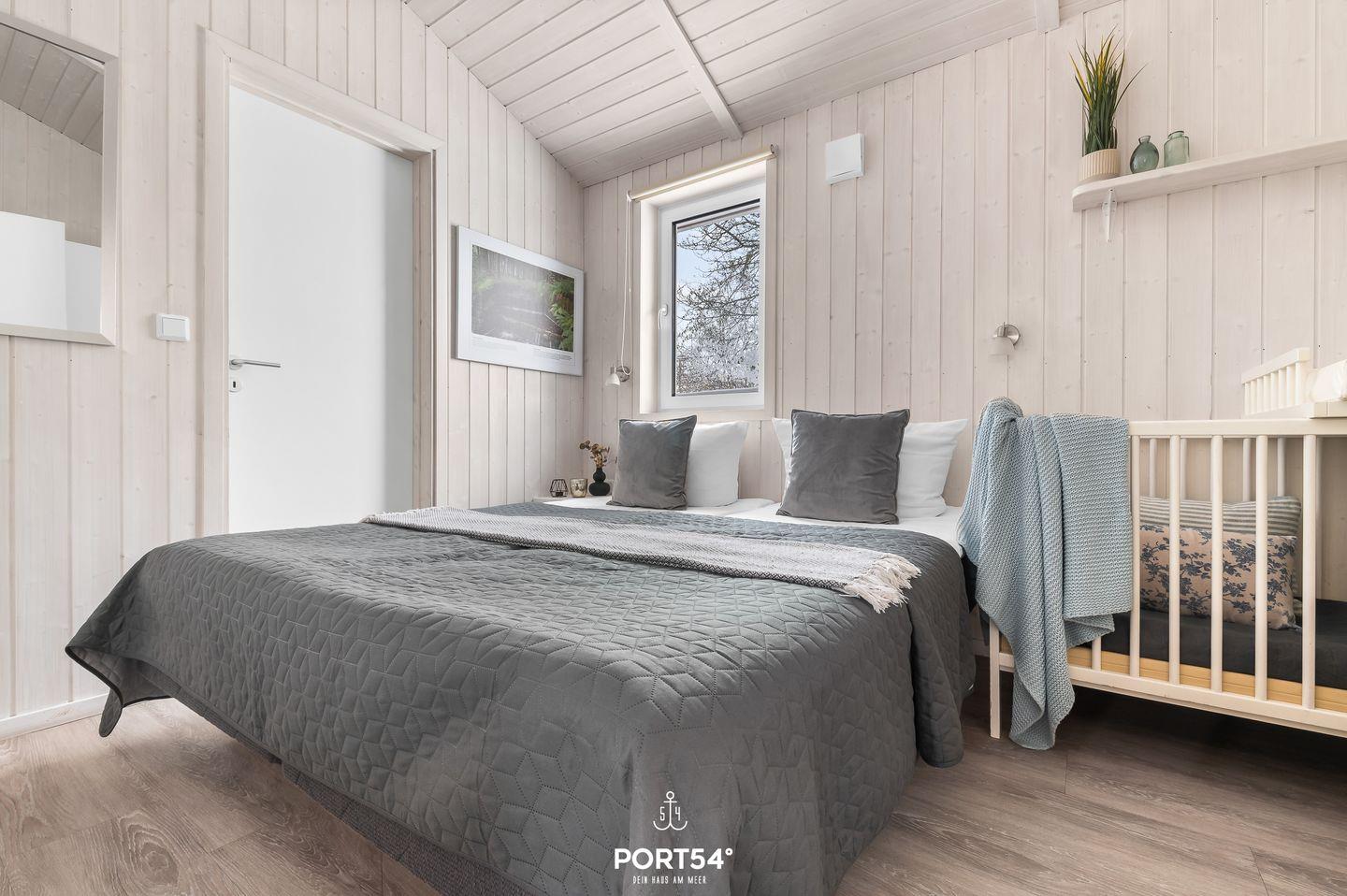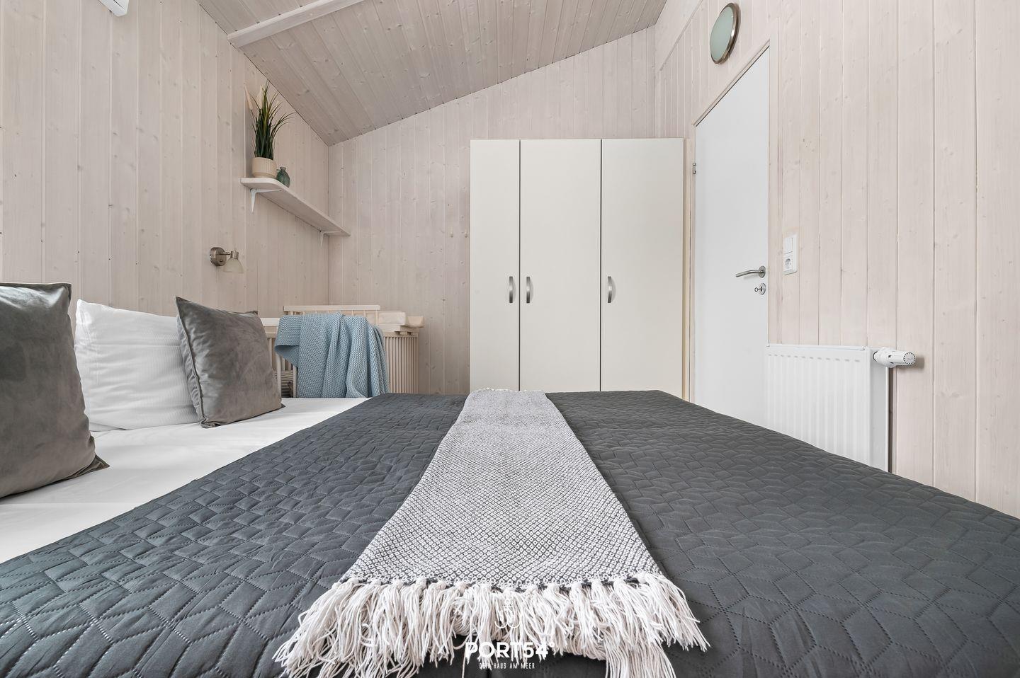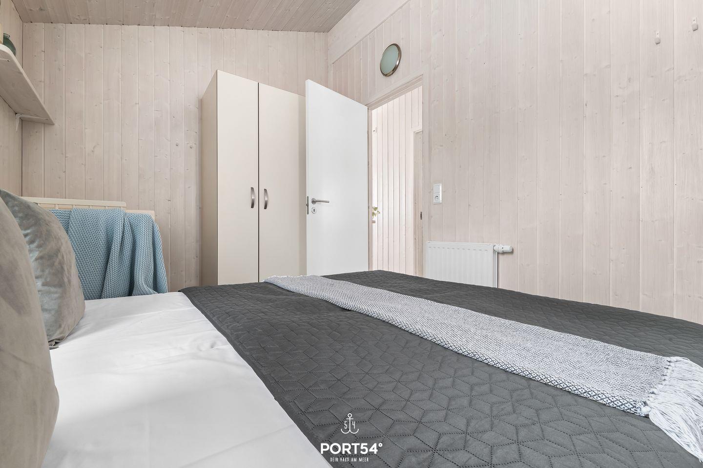 Das Ferienhaus verfügt über zwei Schlafzimmer, die jeweils mit zwei zusammengeschobenen Einzelbetten (zusammen 160 x 200 cm) ausgestattet sind. Die ruhige und naturnahe Farbgestaltung schafft eine angenehme, entspannte Atmosphäre für erholsame Nächte. Im Wohnzimmer findest du eine ausziehbare Schlafcouch (140 x 190 cm), die Platz für zwei weitere Personen bietet – ideal für Kinder oder Freunde. Bettwäsche und Handtücher können optional hinzugebucht werden.