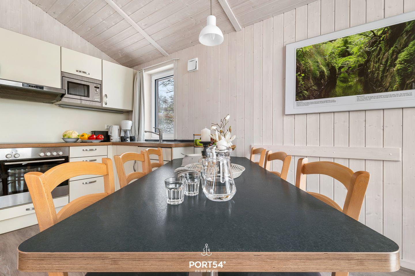 Die voll ausgestattete Wohnküche bietet alles, was du für gemeinsame Kochabende benötigst: ein Cerankochfeld, Backofen, Kühlschrank mit Gefrierfach, Mikrowelle und Kaffeemaschine. Der Essbereich lädt zu gemeinsamen Mahlzeiten und geselligen Gesprächen ein.