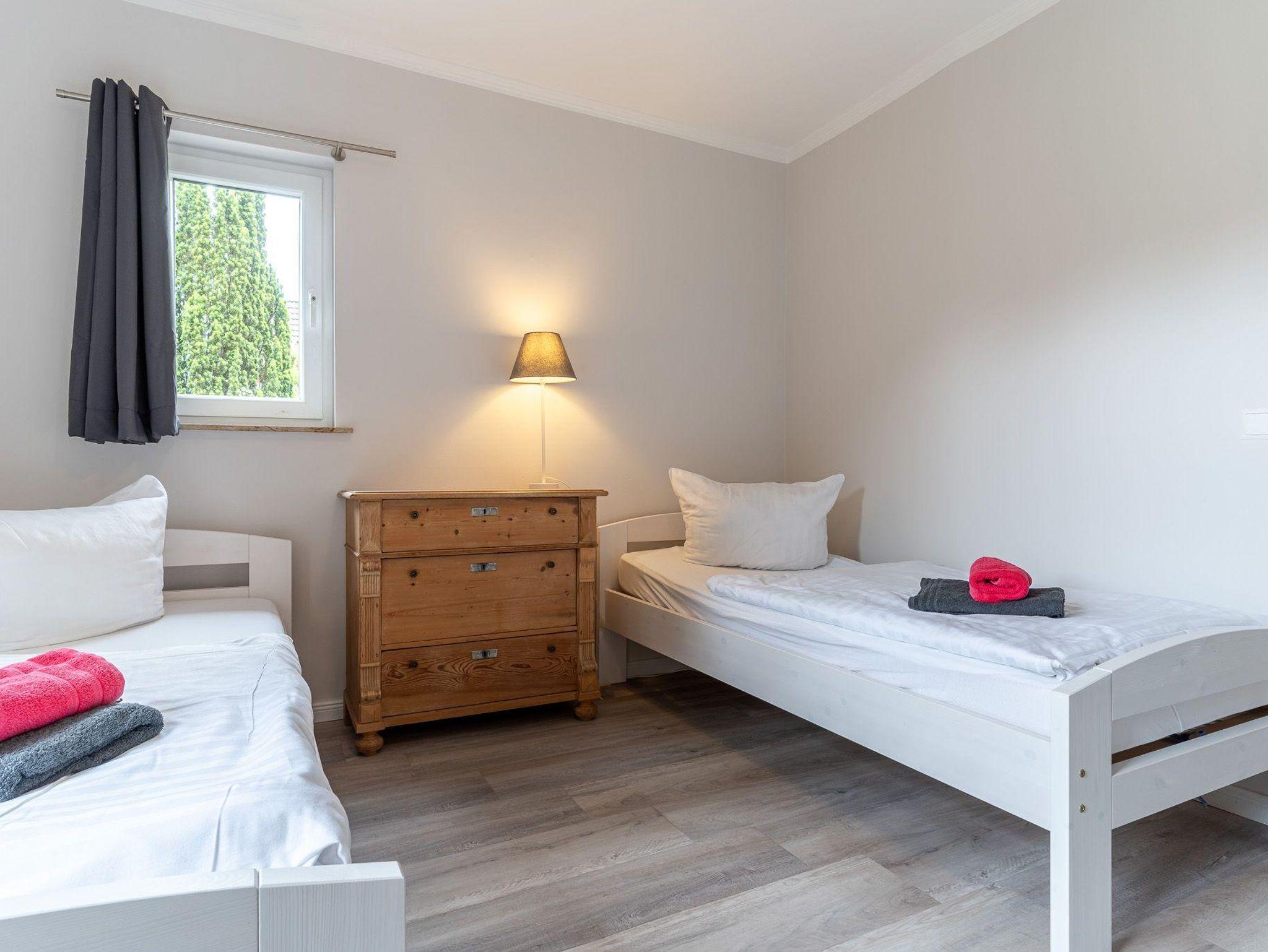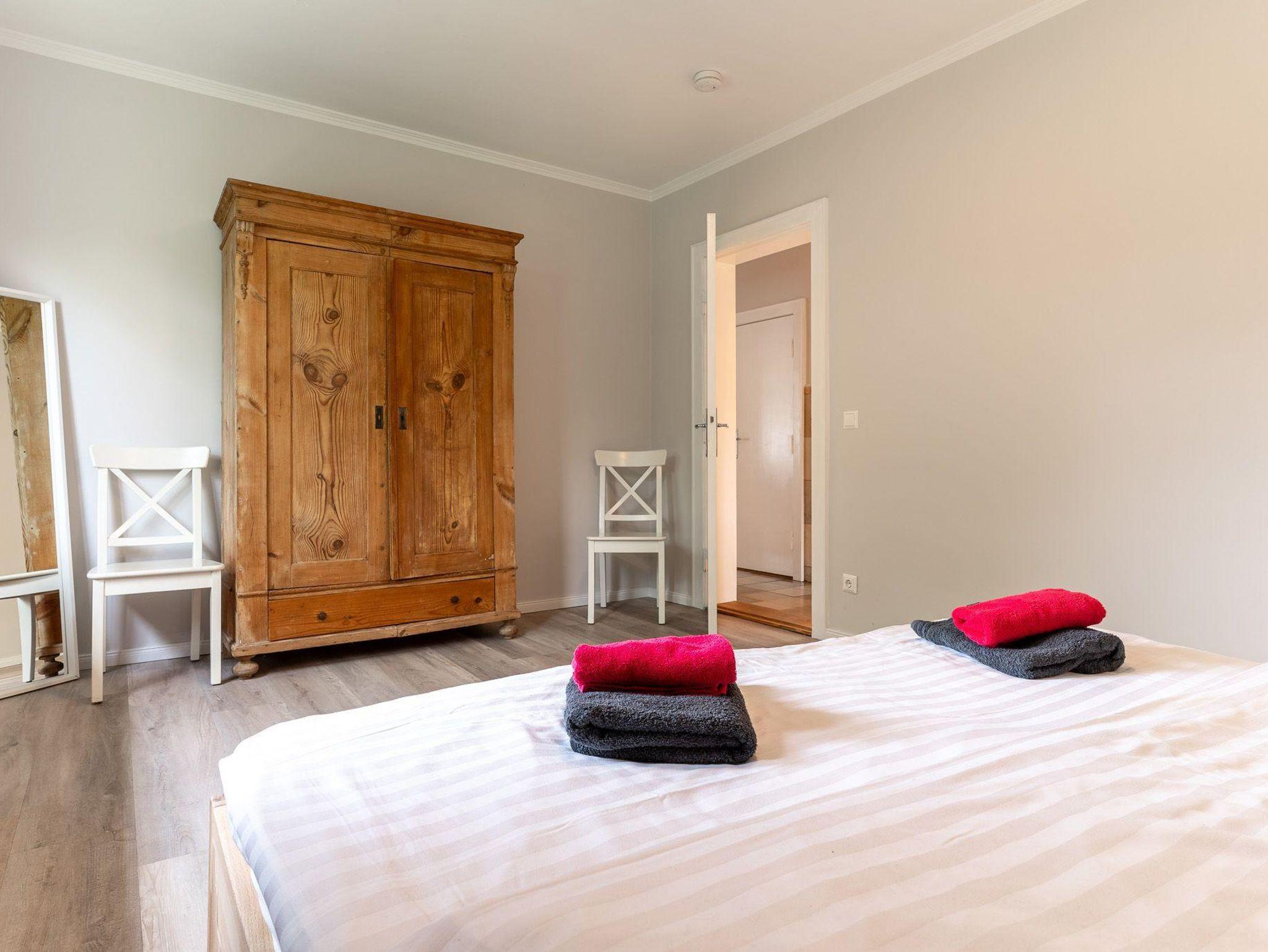 Geschlafen wird entweder im Doppelbett oder in zwei Einzelbetten. In Bauernmöbel verstauen Sie Ihre Wäsche.