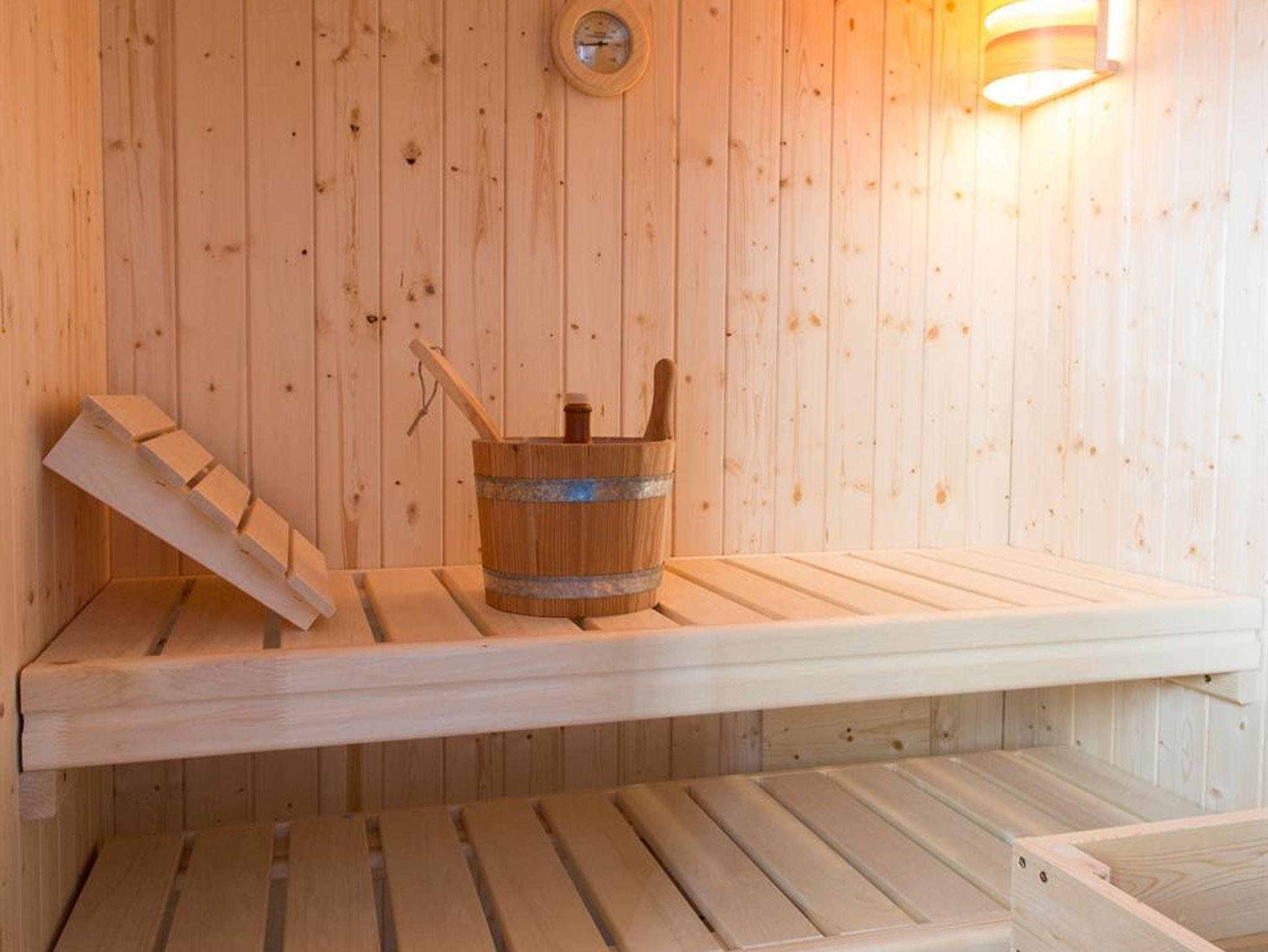 Das hochmoderne Bad verfügt über eine flache Runddusche mit Glasschiebetür, Waschtisch, Fön, WC, Fußbodenheizung und einer exklusiven Sauna. Zudem finden Sie eine Waschmaschine und Trockner. Für Kinder gibt es einen Fußhocker am Waschbecken. Kinderstuhl und Kinderbett sind
