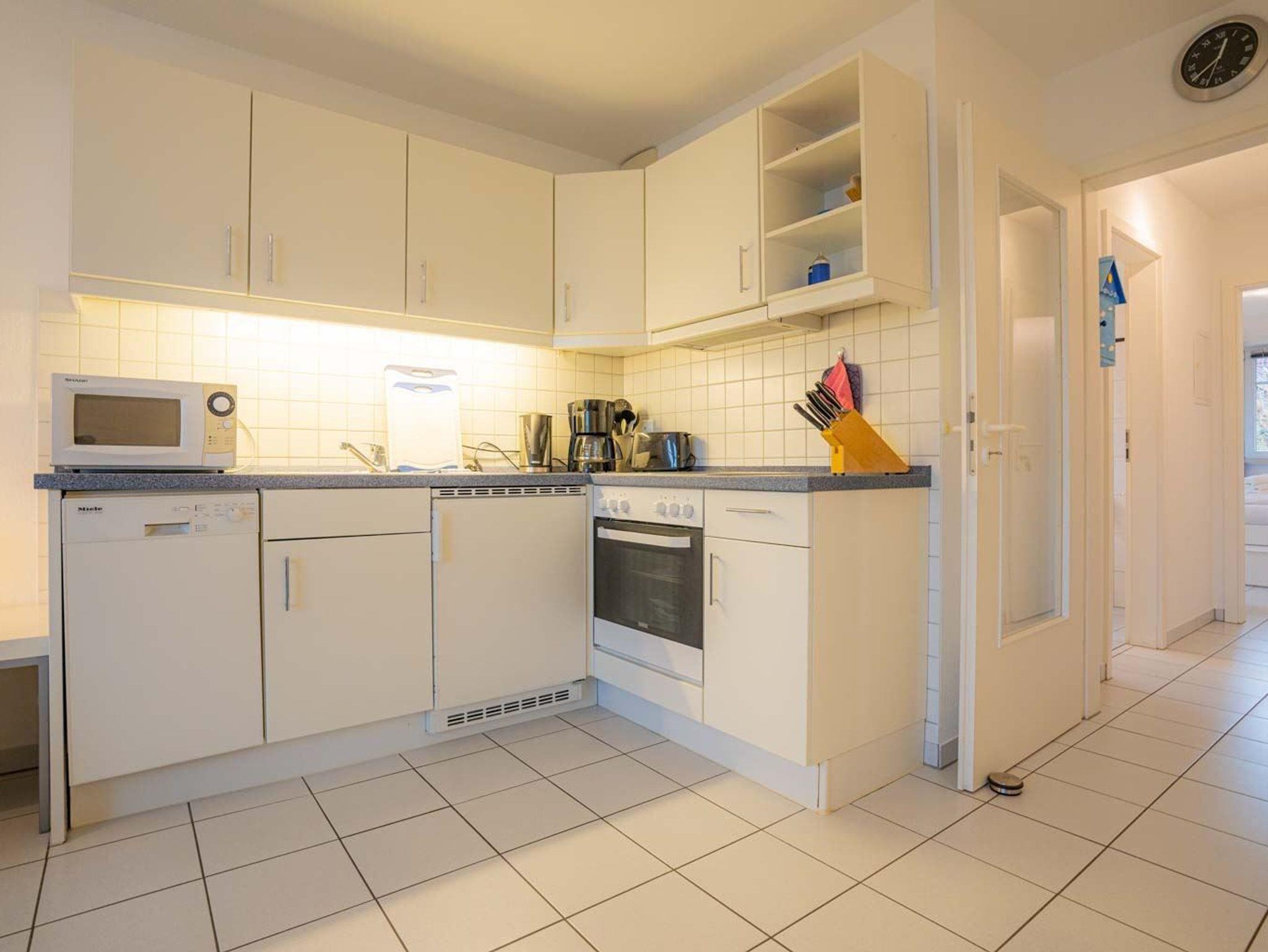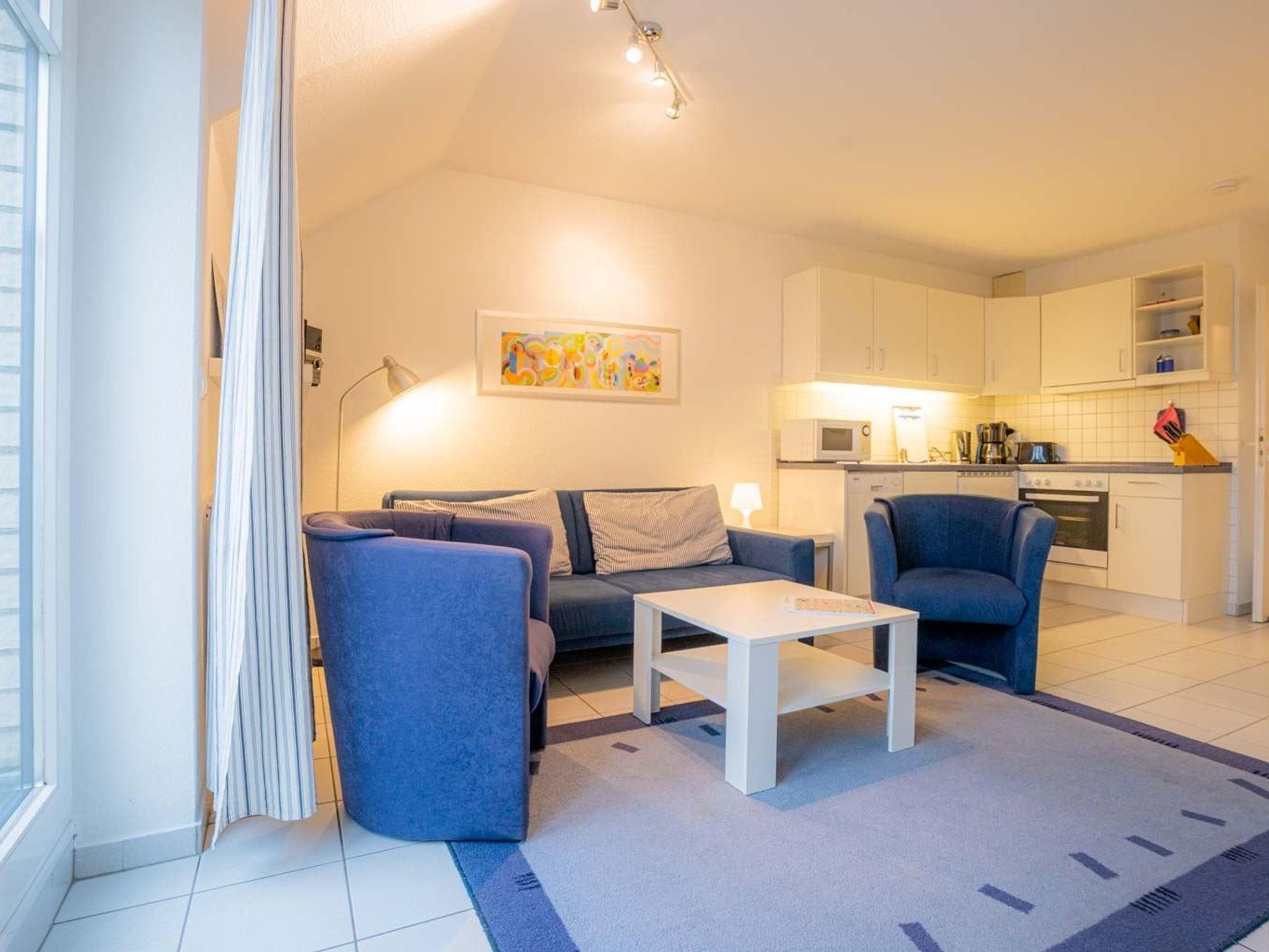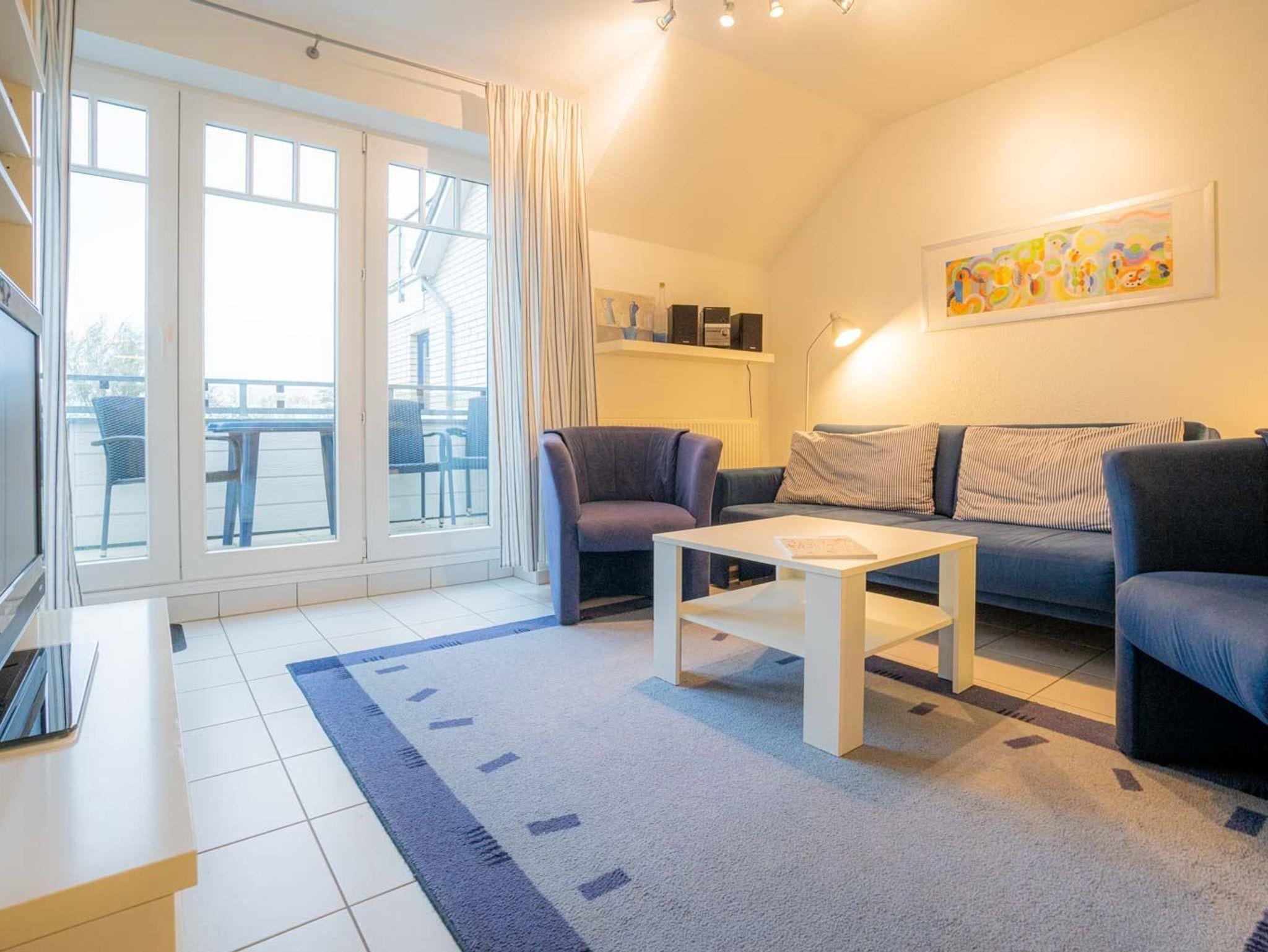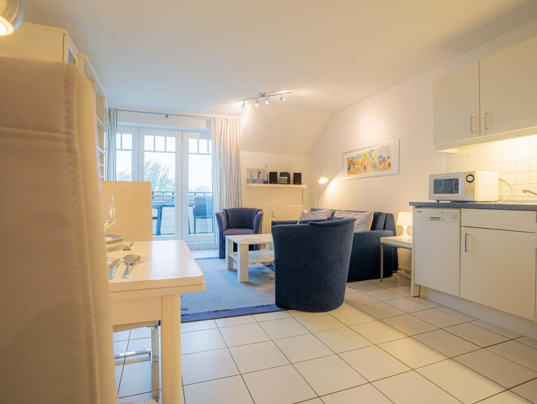 Wohnzimmer mit ausziehbarem Schlafsofa (170 x 190cm), 2 Sesseln, TV (Sat), DVD-Player, Stereoanlage mit CD-Player und Esstisch mit 4 Stühlen. Direkter Zugang zum windgeschützten, möblierten Südbalkon mit schönem Ausblick über den Deich in Richtung Meer. Offene Küche mit Backofen, Geschirrspüler, Kühlschrank mit Gefrierfach und Mikrowelle.