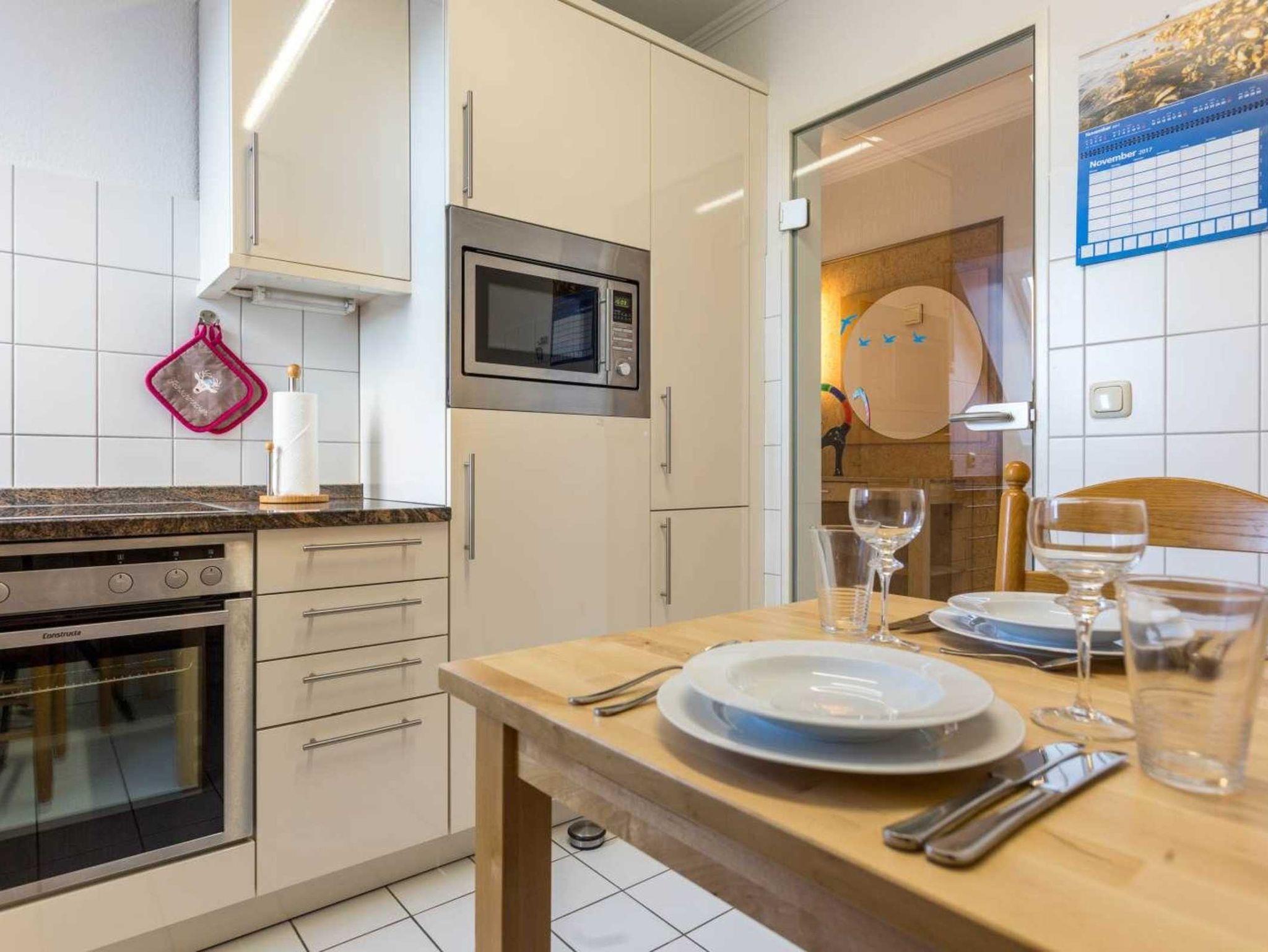 Separate Küche mit Backofen, Mikrowelle, Kühlschrank mit Gefrierfach, Geschirrspüler und Esstisch mit 4 Stühlen.