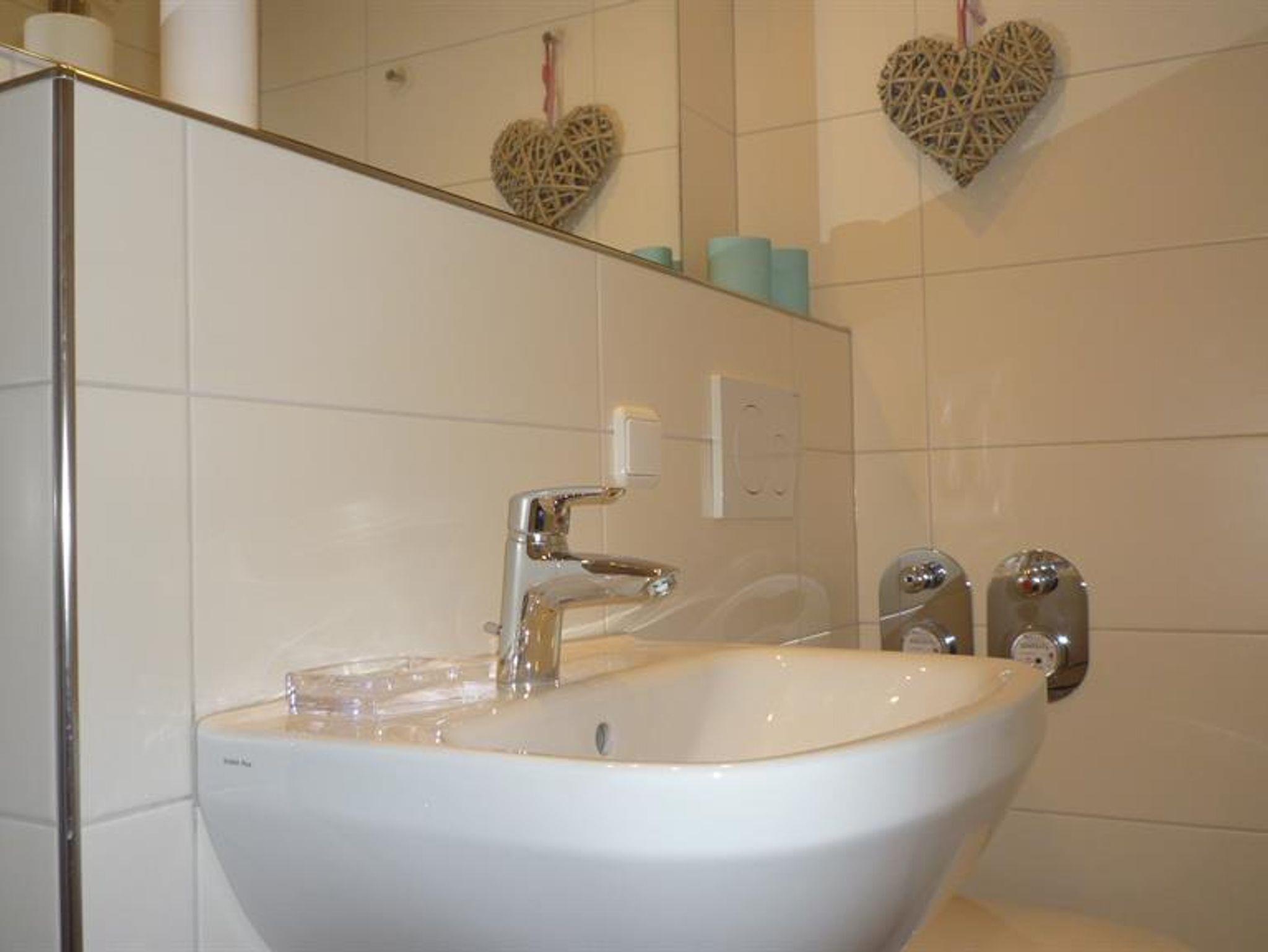 Im Vorraum der Wohnung gibt es eine kleine Küchenzeile mit Kühlschrank (4-Sterne-Gefrierfach) und Ceran-Kochfeld. Außerdem gehört zur Wohnung ein kleines aber hochwertiges Bad mit Dusche.