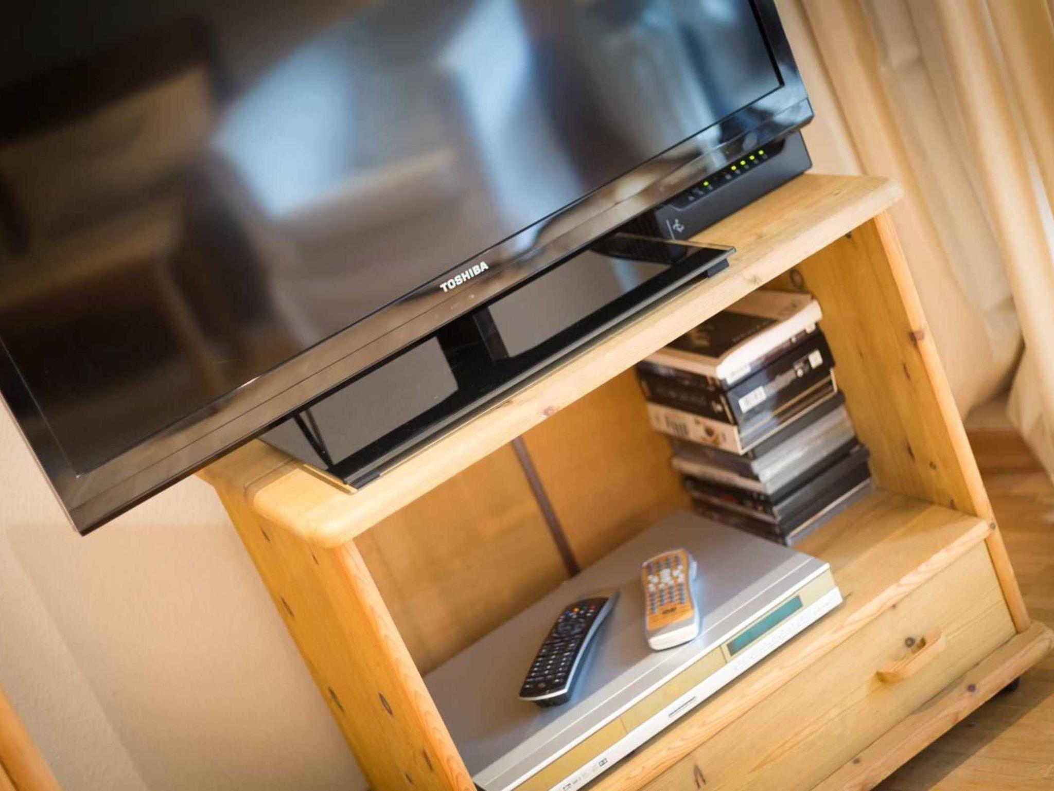 Wohnzimmer mit ausziehbarem Schlafsofa (160x190cm), 2 Sesseln, großem TV (Kabel), DVD-Player, Stereo-Kompaktanlage und Esstisch für 4 Personen. Direkter Zugang zur windgeschützten, möblierten Gartenterrasse nach Süden. Offene Küche mit Backofen, Mikrowelle, Geschirrspüler, Kühlschrank mit Gefrierfach und Schrank mit Staubsauger.