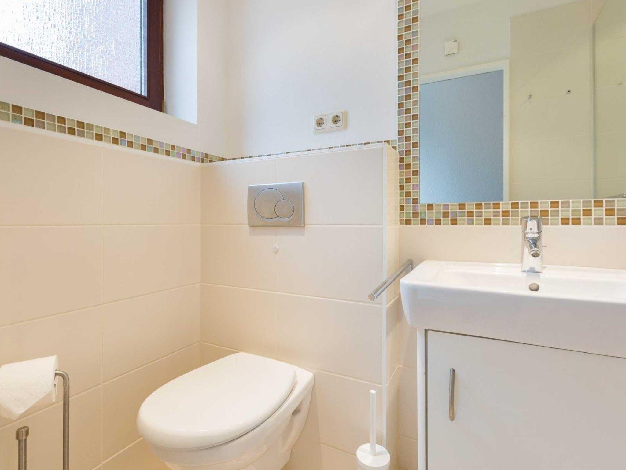 Badezimmer (Duschbad) mit Dusche (Einstieg: ca. 10cm), WC, Handtuchwärmer, Tageslicht und Föhn.