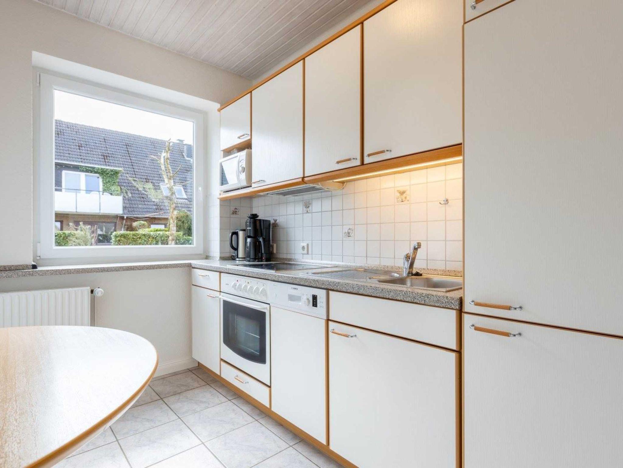 Separate Küche mit Backofen, Mikrowelle, Kühlschrank mit Gefrierfach und Geschirrspüler.