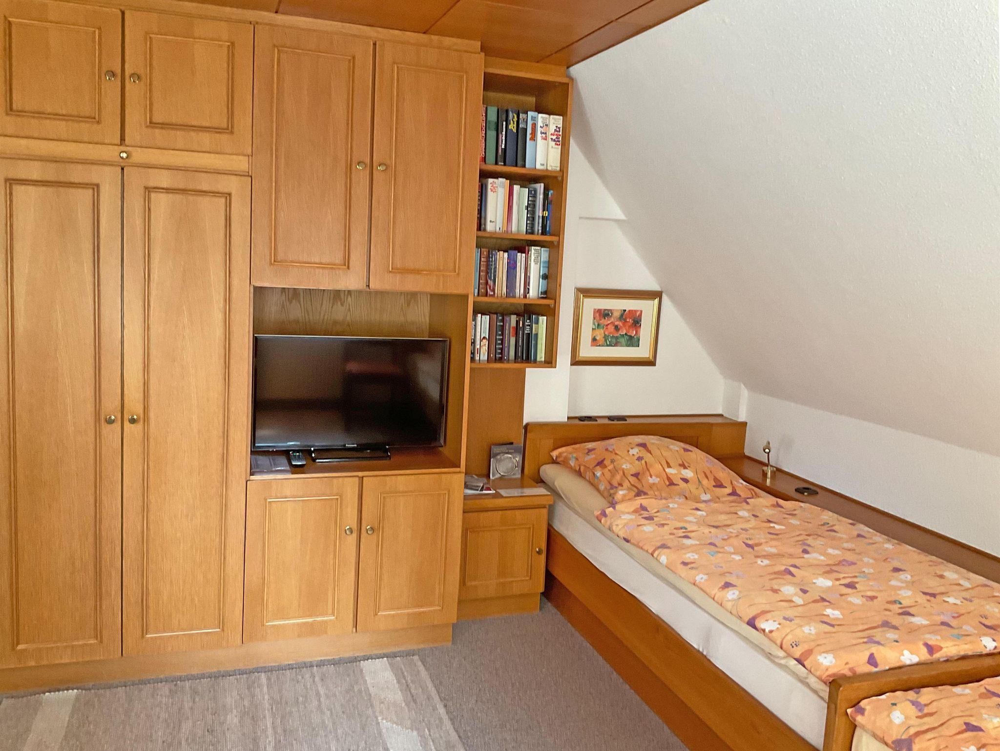 Das helle sonnendurchflutete Appartement ist liebevoll von einem Tischler eingerichtet mit Einzelbetten einem Flachbild TV einer Sitzgruppe und einer Küchenzeile.