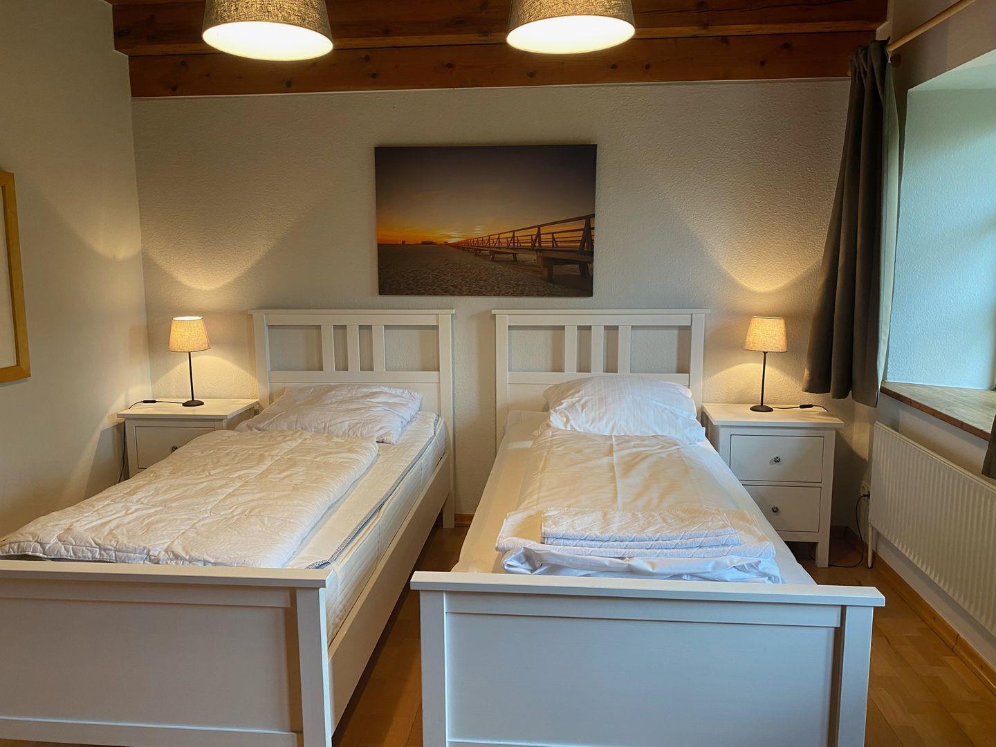 Von der Diele/Flur gehen zwei Schlafräume (1 Doppelbett, 2 Einzelbetten) ab.