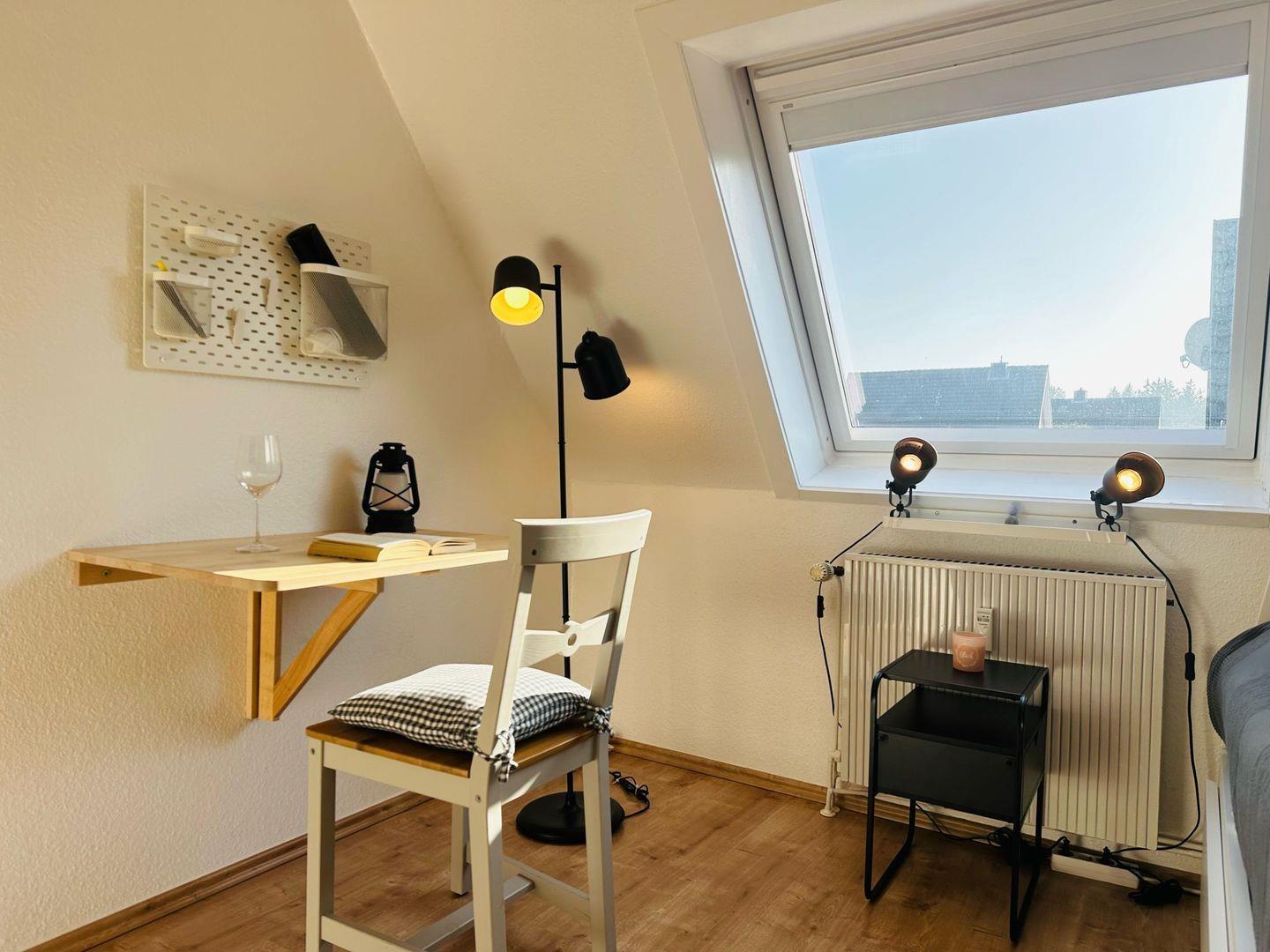 Zusätzlich haben die Gäste die Möglichkeit, einer der Schlafzimmer als Workstation zu nutzen. Ein praktischer Klappschreibtisch sowie ein Glasfaseranschluss bieten ideale Voraussetzungen für produktives Arbeiten in einem komfortablen Umfeld.