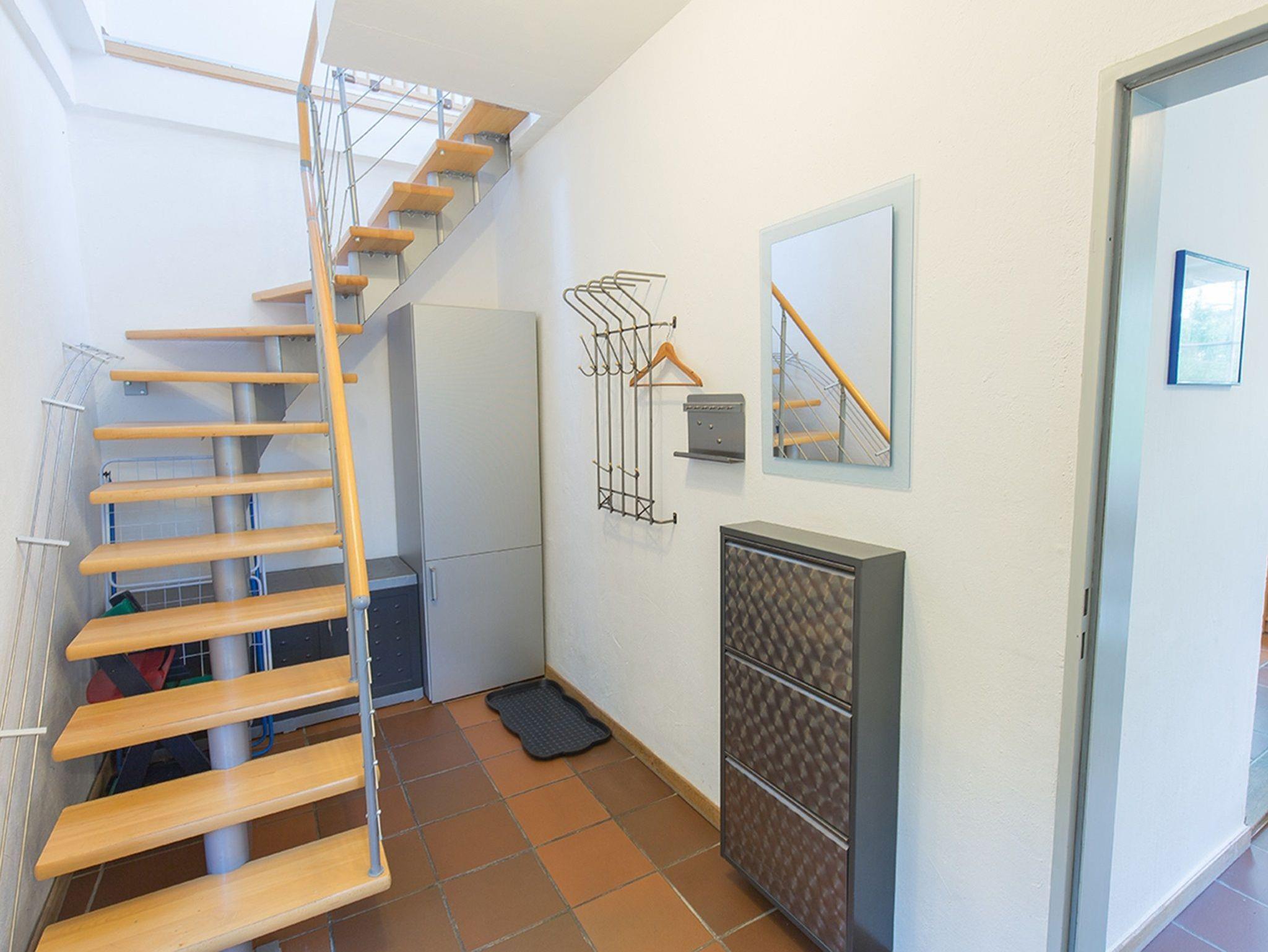 Ab Diele gelangen Sie in den großen gemütlichen Wohn-/Ess-/Kochbereich mit Kaminofen und dem ersten Badzimmer mit Wanne. Eine offene Holztreppe führt ins Obergeschoß zum zweiten Badezimmer mit Dusche sowie den beiden Schlafräumen. Ein Schlafzimmer hat ein komfortables Doppelbett und das andere insgesamt drei Einzelbetten. Nutzen Sie ihre eigene große Terrasse mit Blick ins Grüne.