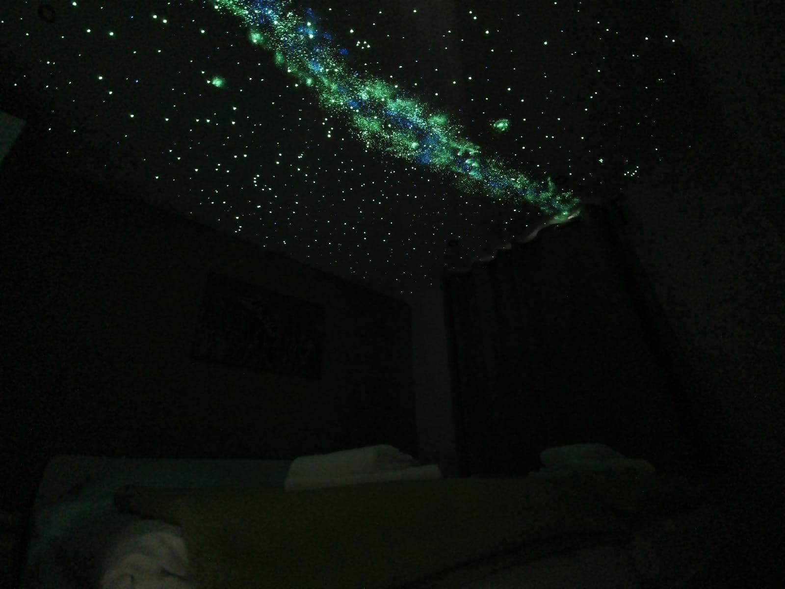 Das einzigartige Highlight des Ferienhauses Biber, ist der nachtleuchtende Sternenhimmel an der Zimmerdecke des großen Schlafzimmers. Es erwarten Sie die Winter-Sternenbilder mit der Milchstraße und mehr.